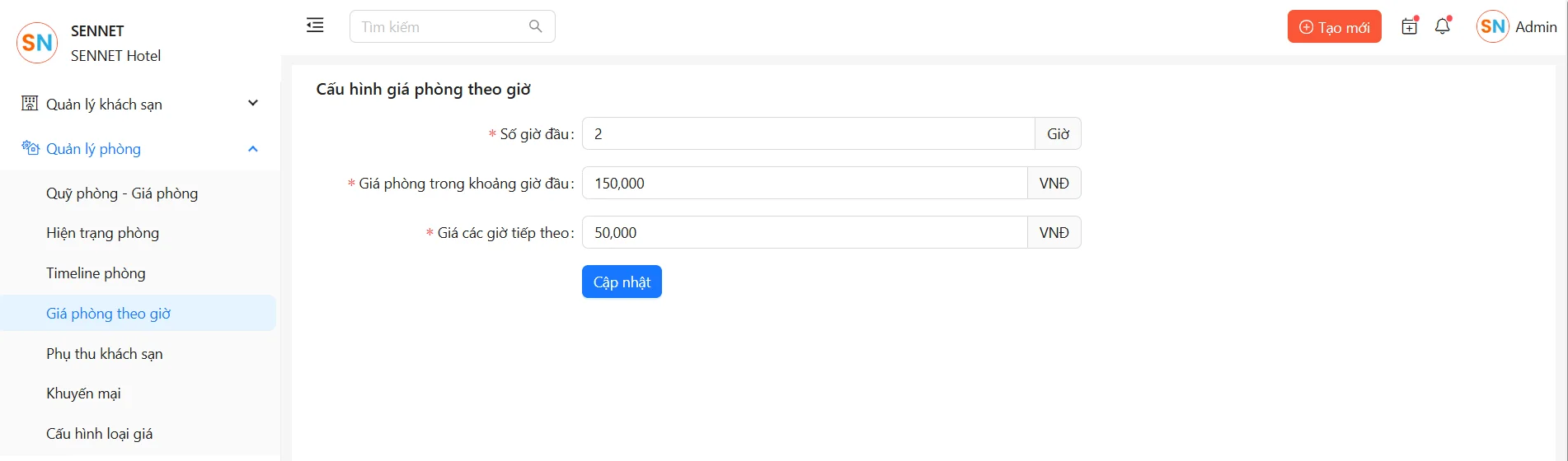 Tính năng này cho phép thiết lập giá bán phòng theo giờ theo cấu trúc: X giờ đầu có giá A, mỗi giờ tiếp theo sẽ có giá B.