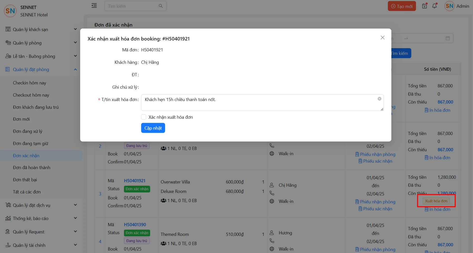 Với các Booking mà khách có lấy hóa đơn, sau khi kế toán xuất hóa đơn cho khách xong thì cần xác nhận trên Booking là "Đã xuất hóa đơn", việc này nhằm quản lý được xem Booking đã xuất hóa đơn rồi hay chưa.