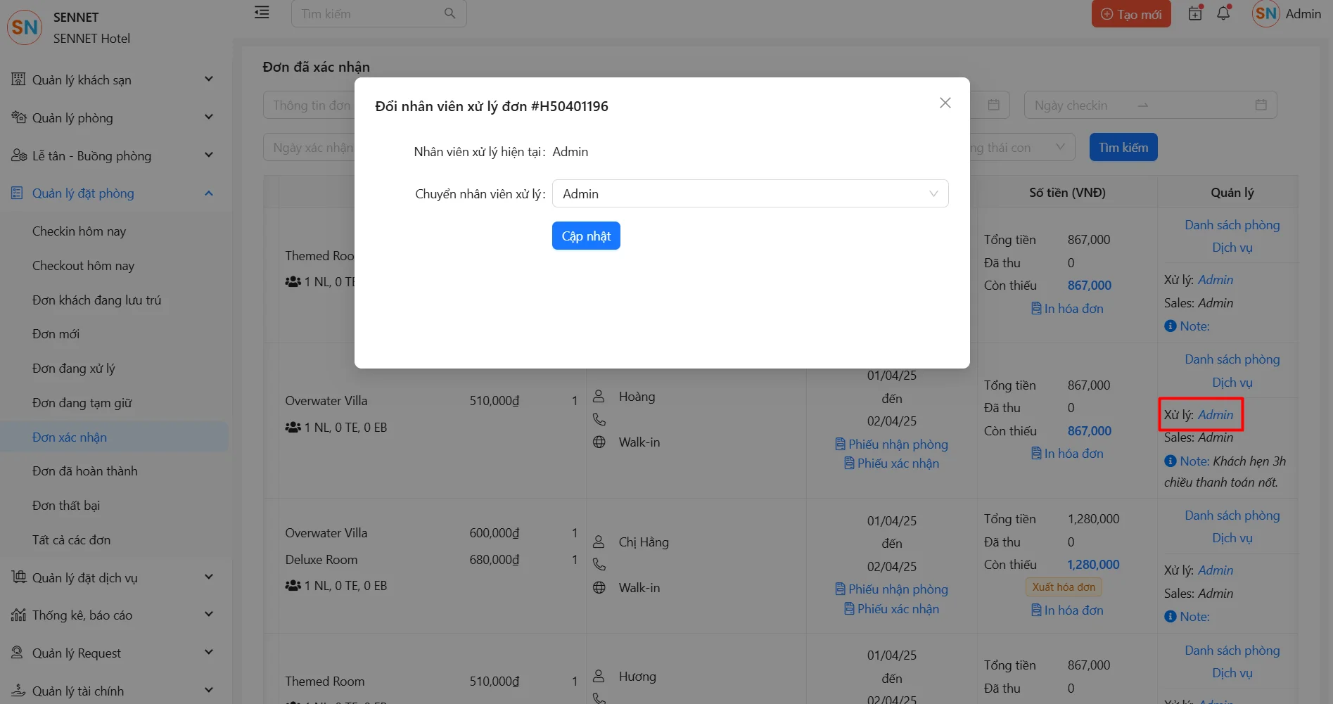 Truy cập module "Quản lý đặt phòng", vào danh sách các Booking, click vào tên của nhân viên đang xử lý Booking để mở popup chuyển nhân viên xử lý: