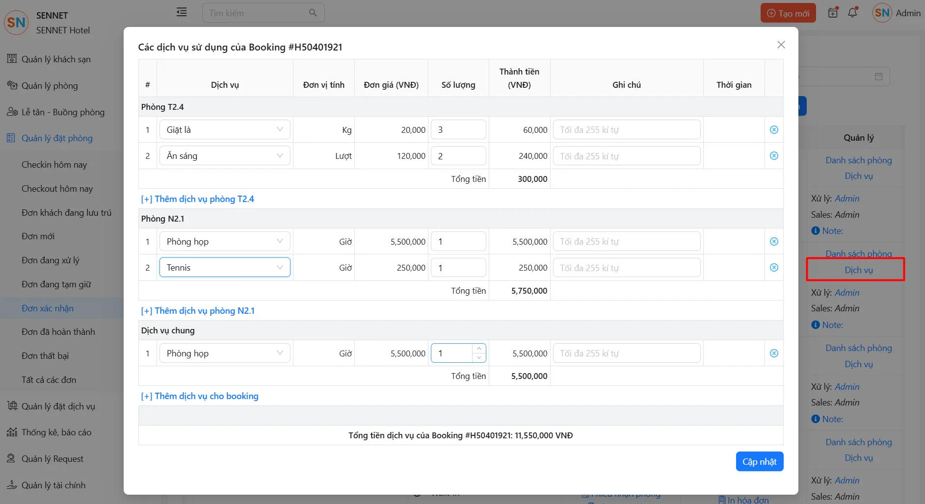 Truy cập module "Quản lý đặt phòng", vào danh sách "Đơn xác nhận", click vào "Dịch vụ". Có thể thêm dịch vụ sử dụng cho từng phòng hoặc cho chung cả Booking.