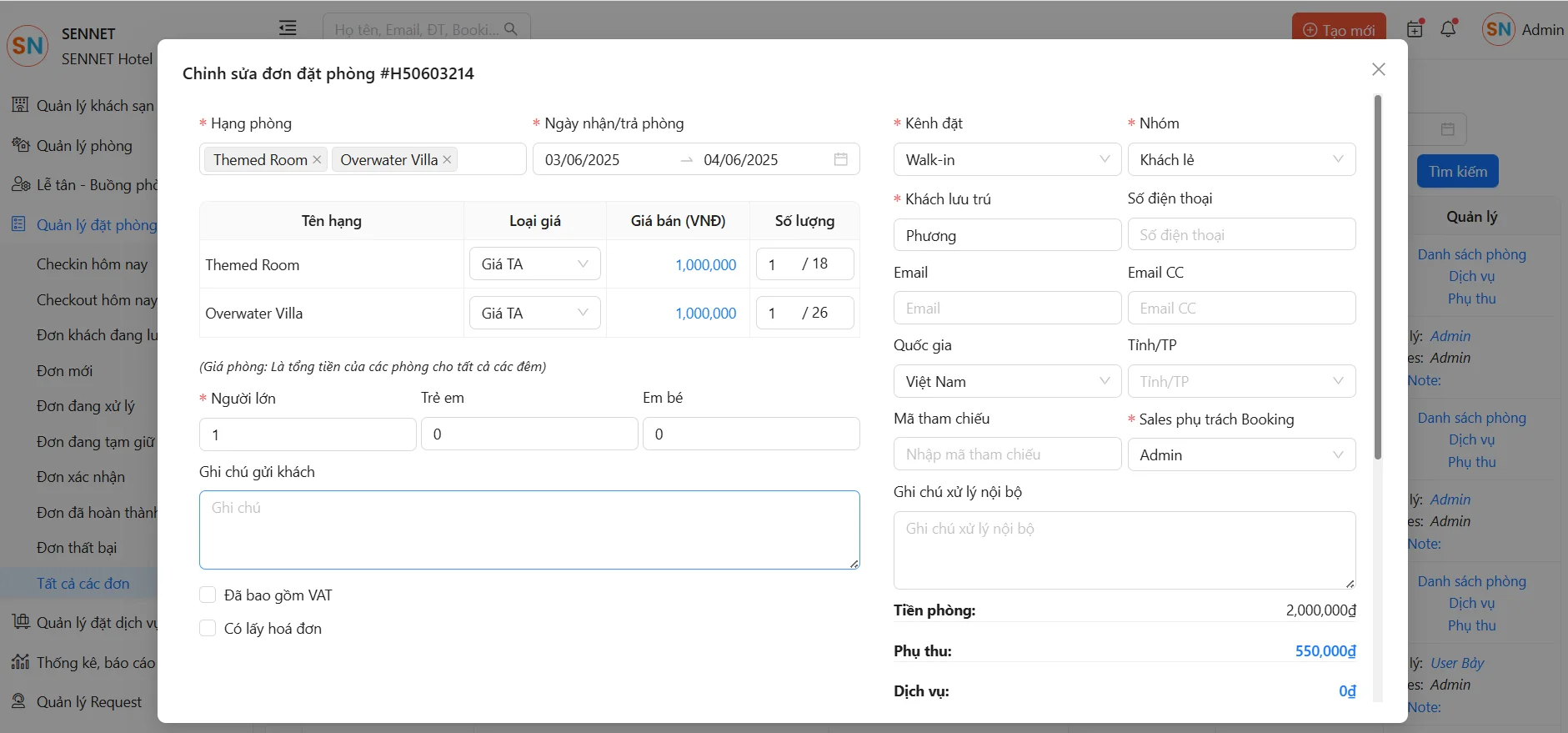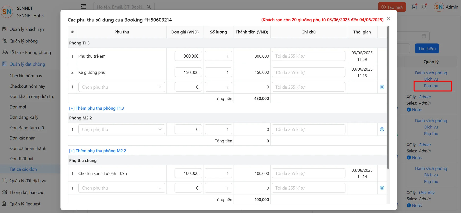 Truy cập module "Quản lý đặt phòng", vào danh sách Booking, click vào "Phụ thu". Có thể thêm phụ thu sử dụng cho từng phòng hoặc cho chung cả Booking.