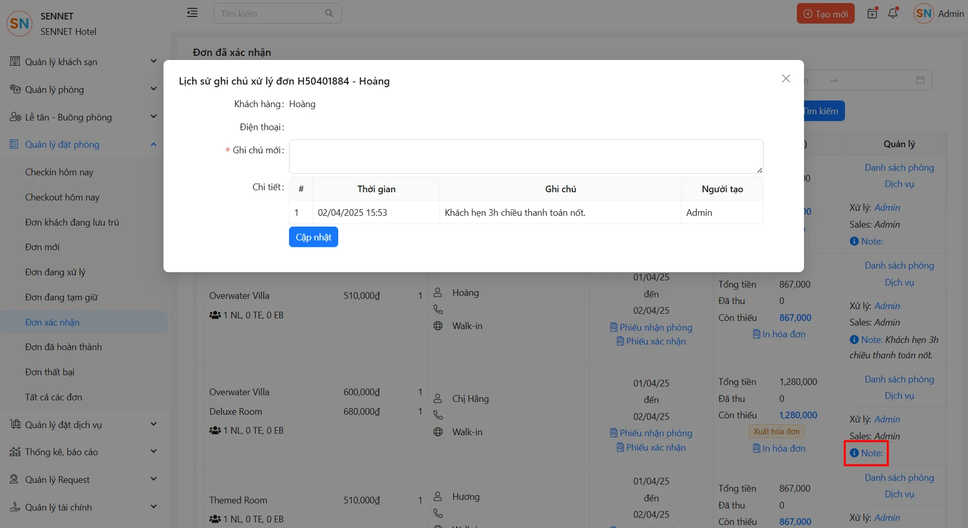 Truy cập module "Quản lý đặt phòng", vào danh sách các Booking, click vào icon "Note" để cập nhật các ghi chú xử lý nội bộ.