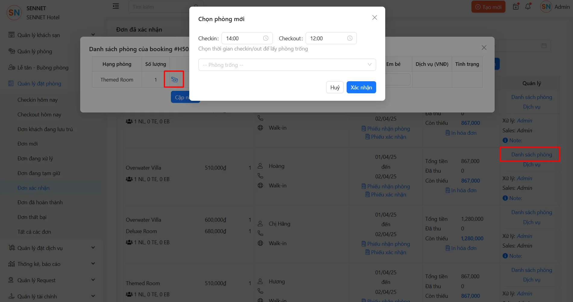 Truy cập module "Quản lý đặt phòng", vào danh sách "Đơn xác nhận", click vào "Danh sách phòng". Tại popup xếp phòng, click vào icon "Phòng" để lựa chọn phòng cho Booking.