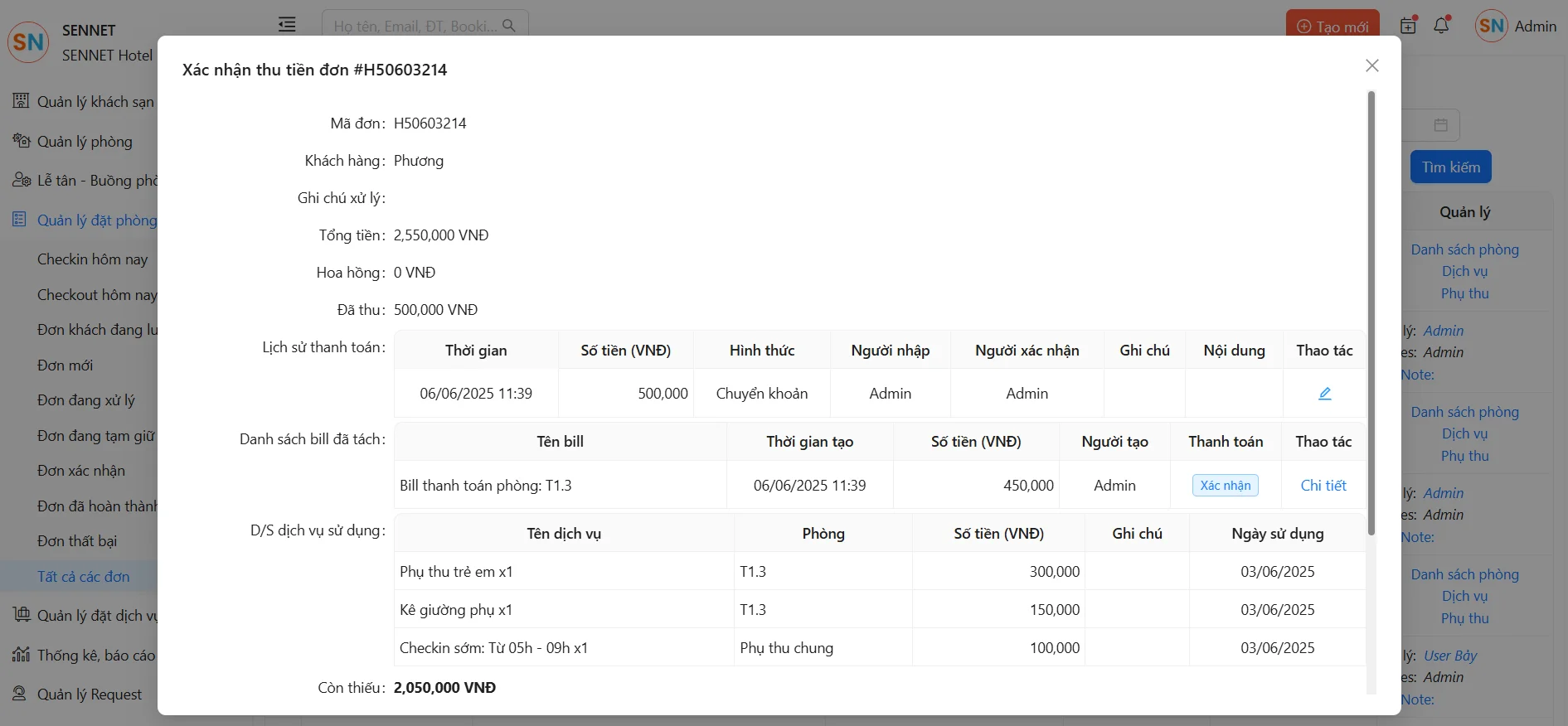 Truy cập module "Quản lý đặt phòng", vào danh sách các Booking, click vào "số tiền còn thiếu" của Booking để mở popup Xác nhận thu tiền.