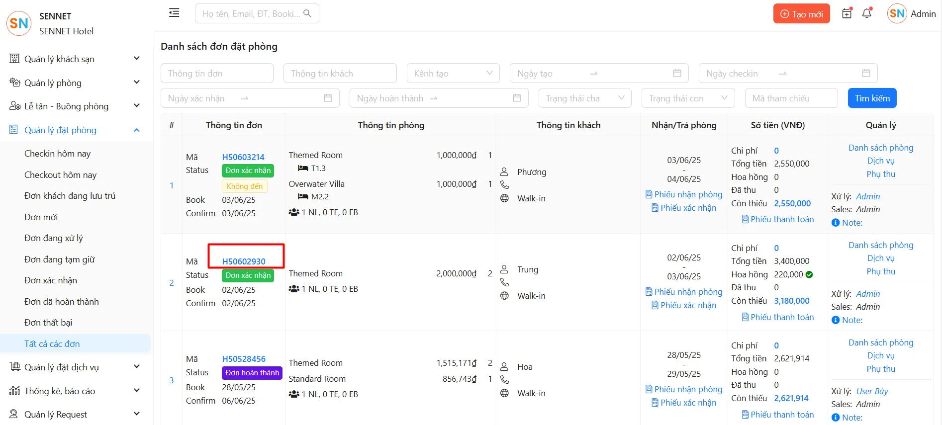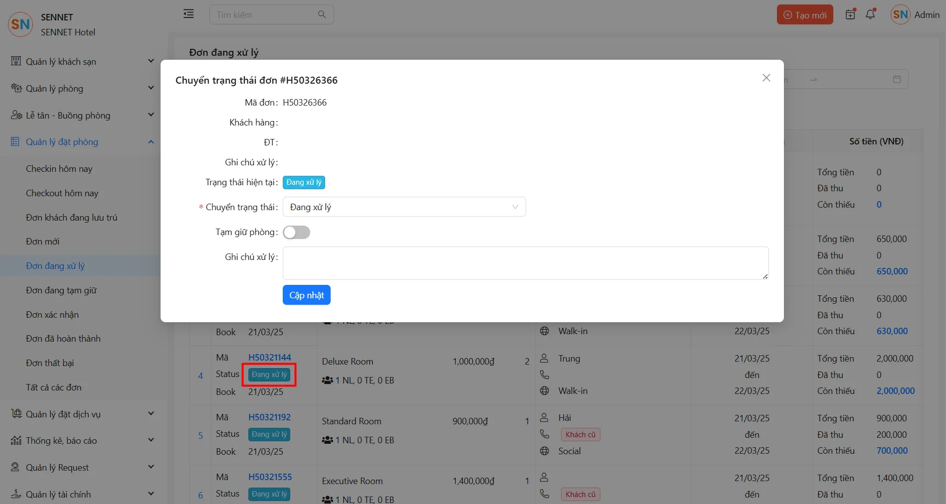 - Đơn đang xử lý: Là những Booking vẫn đang ở quá trình tư vấn khách hàng, chưa được xác nhận đặt phòng.