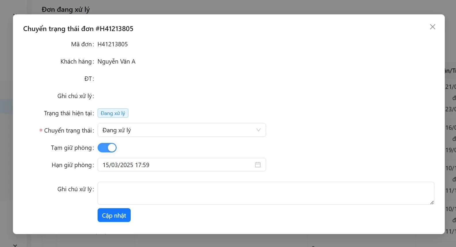 Với các Booking "Đang xử lý" sẽ có thêm lựa chọn "Tạm giữ phòng", thời hạn giữ phòng sẽ được lấy mặc định theo cấu hình của khách sạn (xem hướng dẫn tại đây) và có thể tùy chỉnh theo ý muốn.