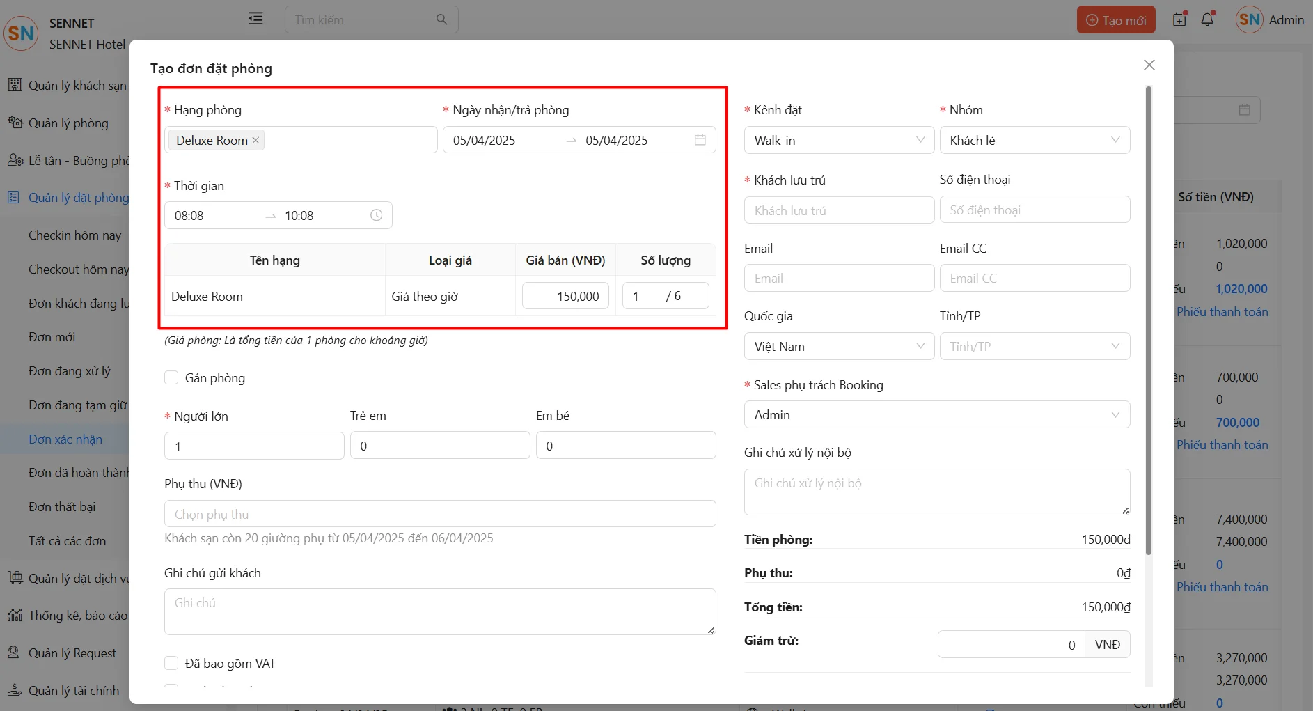 - Cần phải tạo các phòng cho khách sạn trước khi tạo đơn đặt phòng.