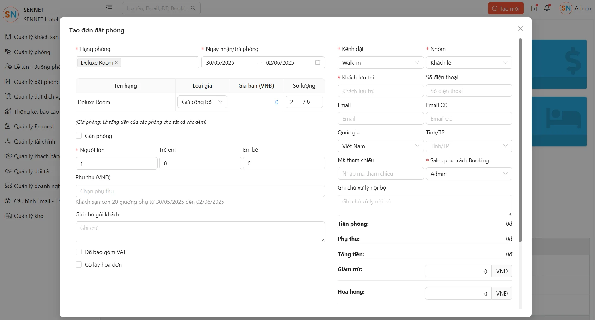 - Để hệ thống tự động áp dụng giá bán mặc định, cần tạo các loại giá cho khách sạn trước khi tiến hành tạo mới đơn đặt phòng.