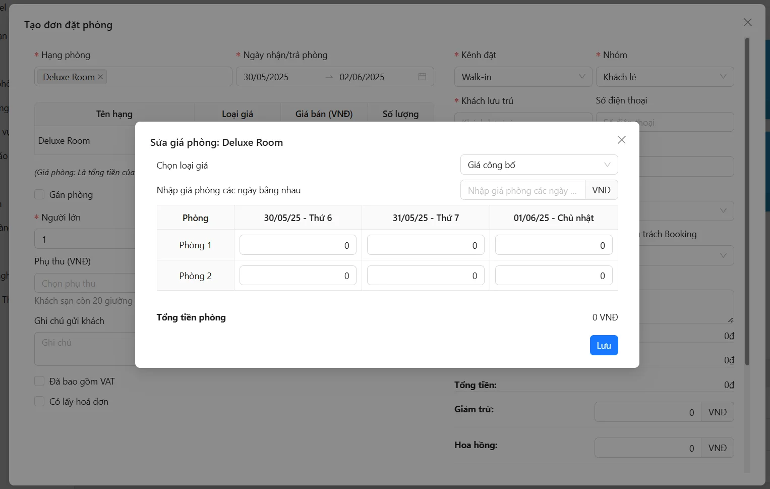 - Xem hướng dẫn tạo hạng phòng tại đây, xem hướng dẫn cấu hình loại giá tại đây.