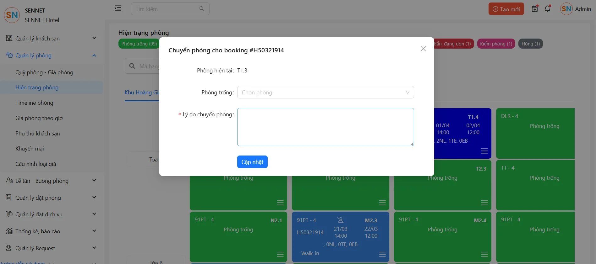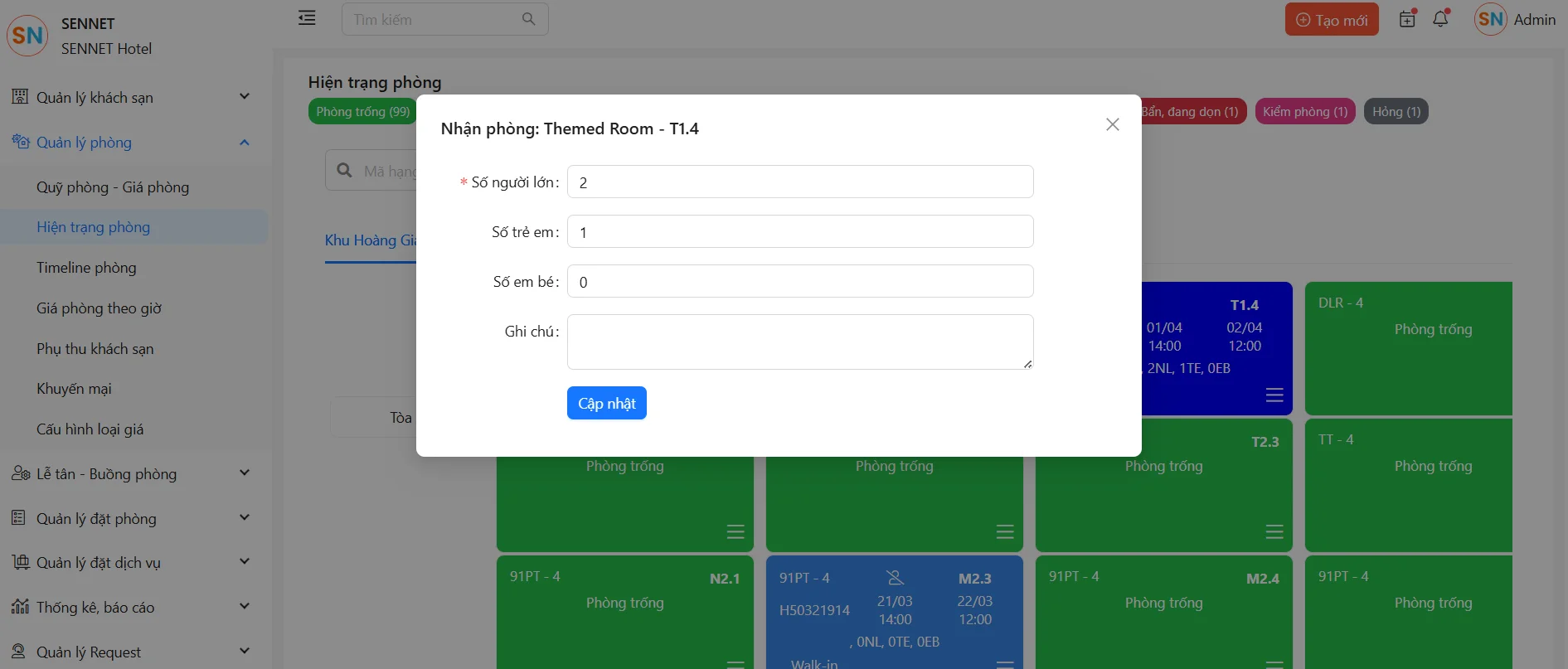 - Chuyển trạng thái phòng sang "Nhận phòng":
