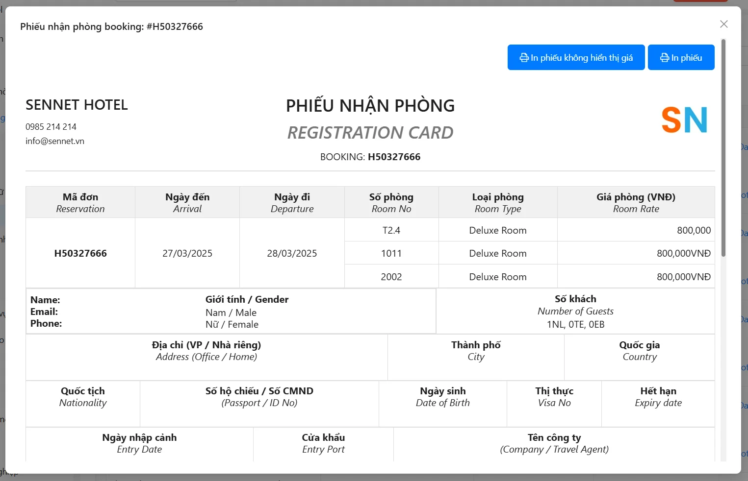 + Truy cập module "Quản lý đặt phòng", mục "Đơn xác nhận", tìm mã Booking và click vào "Phiếu nhận phòng" để xem lại toàn bộ thông tin nhận phòng cùng các quy định của khách sạn, in phiếu và đưa cho khách ký xác nhận.