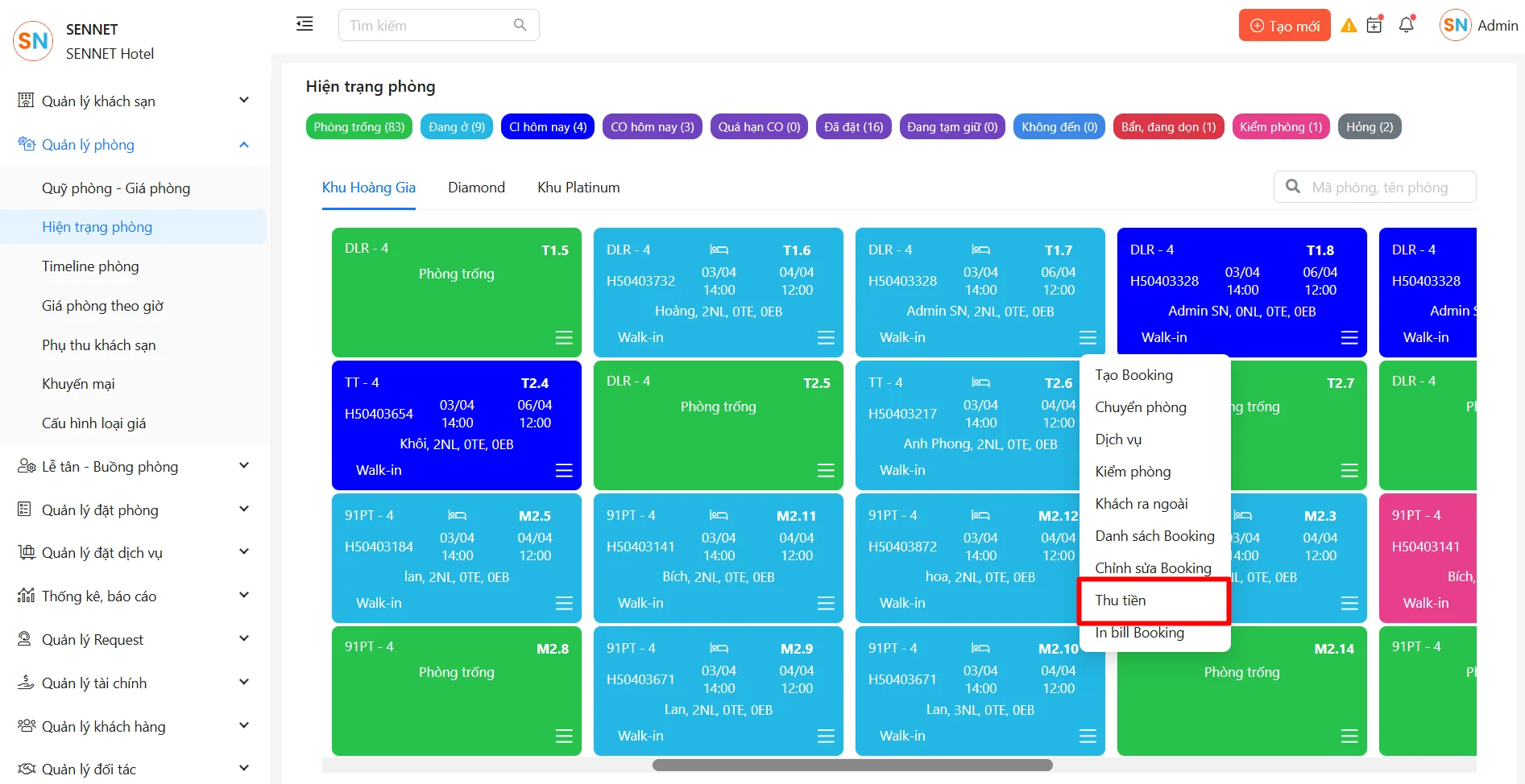 Khi khách trả phòng, truy cập vào module "Quản lý phòng", mục "Hiện trạng phòng", tìm đến phòng mà khách đang ở, click vào Menu xử lý chọn "Thu tiền":