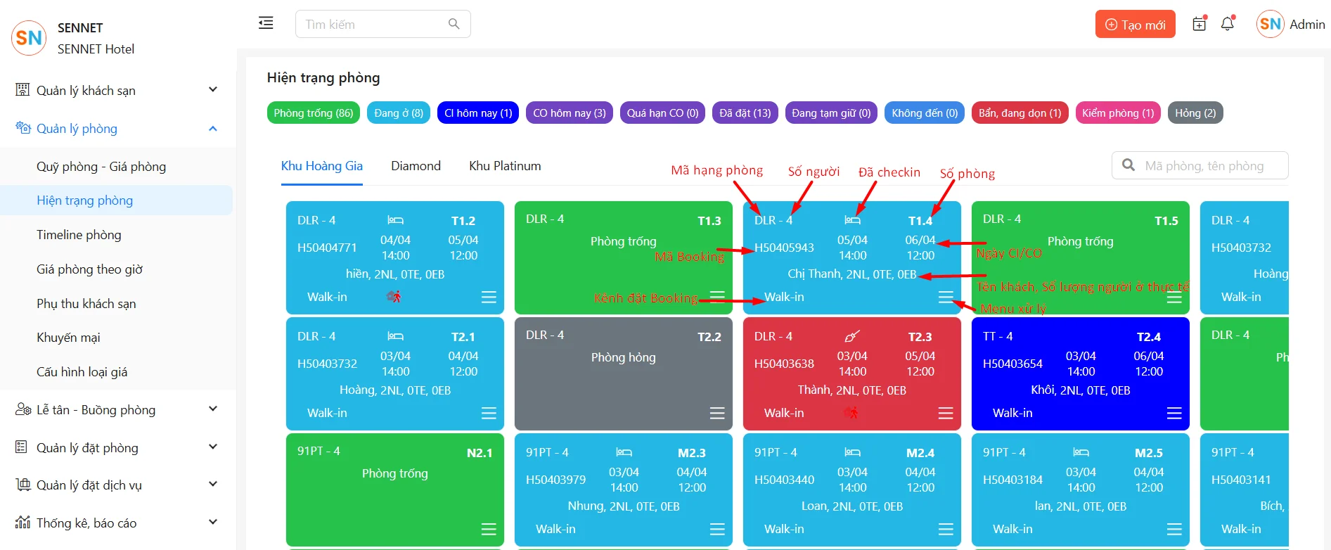 Hầu hết các nghiệp vụ của bộ phận Lễ Tân đều nằm ở module "Quản lý phòng", mục "Hiện trạng phòng":