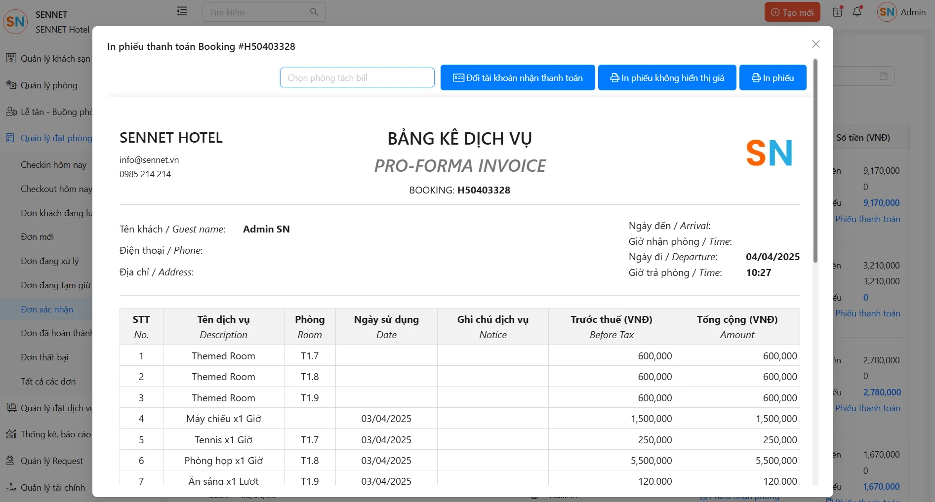 Sau khi phòng đã được kiểm xong, Lễ Tân sẽ tiến hành thủ tục trả phòng và in phiếu thanh toán cho khách: Truy cập module "Quản lý đặt phòng", mục "Đơn xác nhận", tìm mã Booking và click "In phiếu":