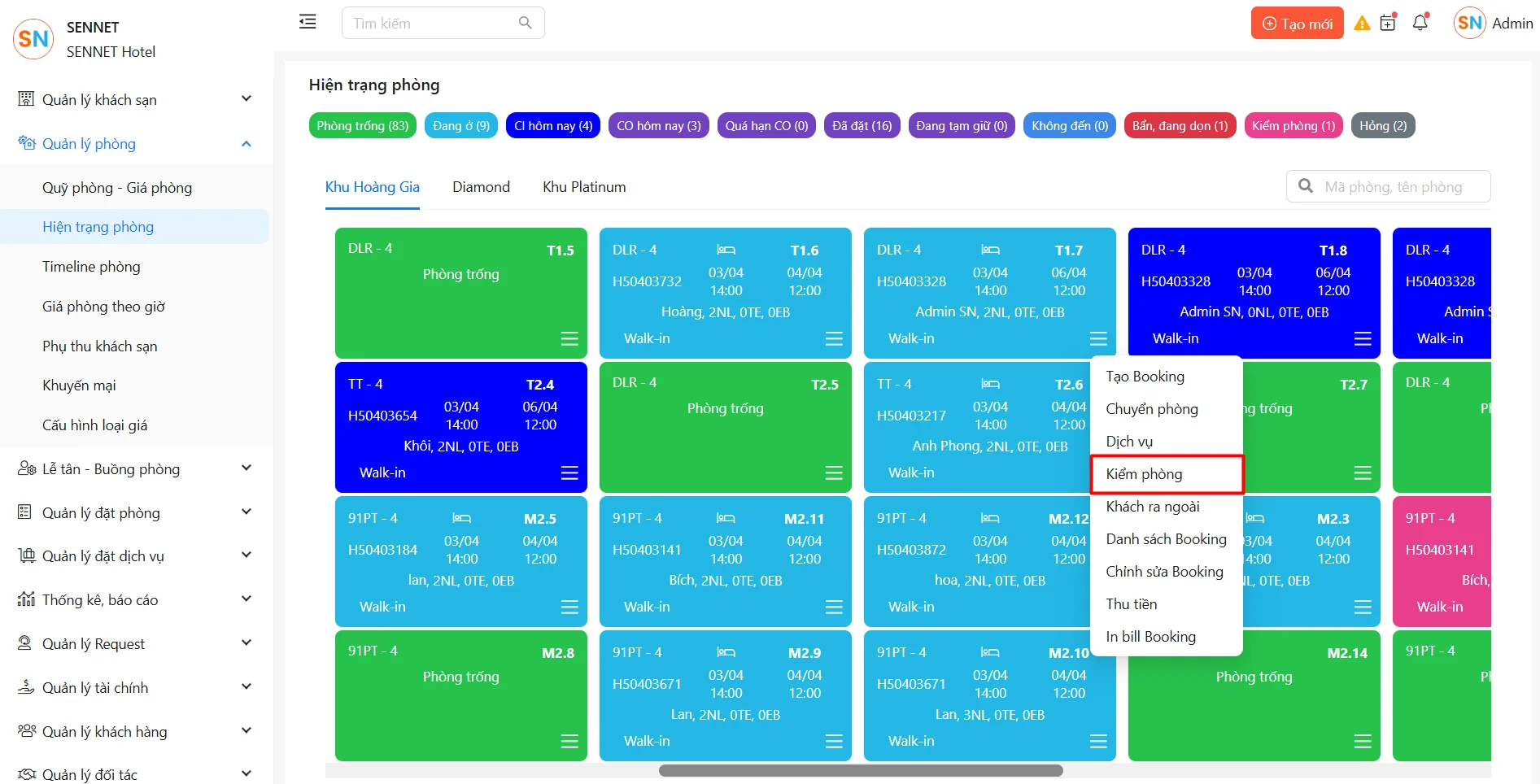 Khi khách trả phòng, truy cập vào module "Quản lý phòng", mục "Hiện trạng phòng", tìm đến phòng mà khách đang ở, click vào Menu xử lý chọn "Kiểm phòng":