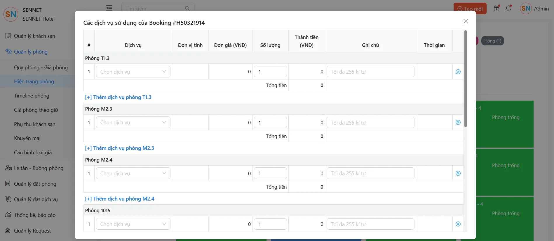 Nhập các dịch vụ trả phí mà khách sử dụng, có thể nhập dịch vụ vào riêng từng Phòng hoặc cho chung cả Booking: