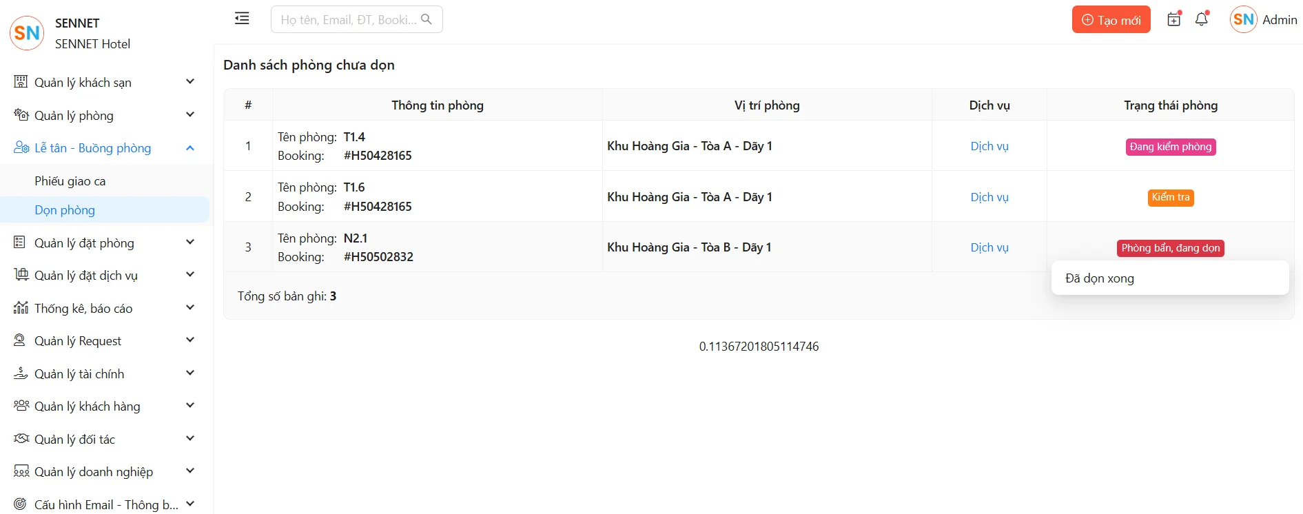 Bộ phận Buồng Phòng truy cập vào module "Lễ tân - Buồng phòng", mục "Dọn phòng" để xem danh sách các phòng cần dọn. Trong quá trình kiểm phòng, bộ phận Buồng Phòng cũng có thể cập nhật các dịch vụ trả phí mà khách đã sử dụng trong phòng vào Booking để cho lễ tân tự động tính tiền cho khách (việc này tùy thuộc vào sự phân quyền của mỗi khách sạn).