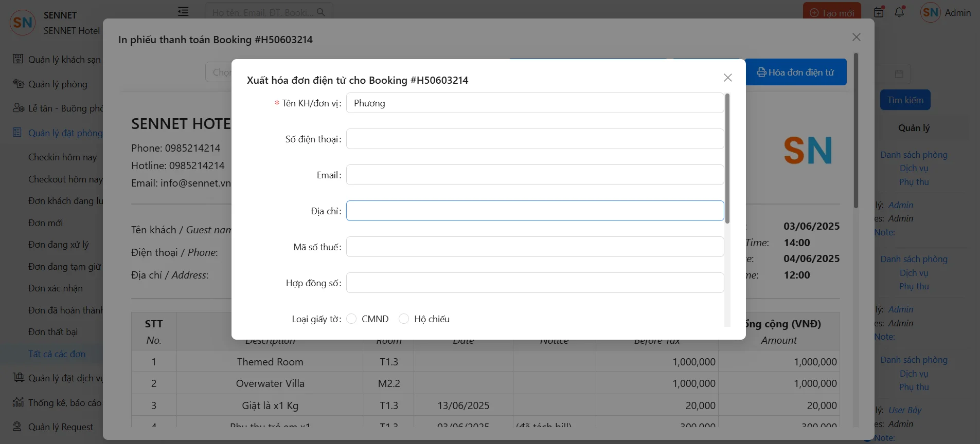 Truy cập "Danh sách đơn đặt phòng", chọn Booking cần xuất hóa đơn. Click "Phiếu thanh toán", sau đó chọn "Hóa đơn điện tử" và tiến hành nhập đầy đủ các thông tin cần thiết để lập hóa đơn.