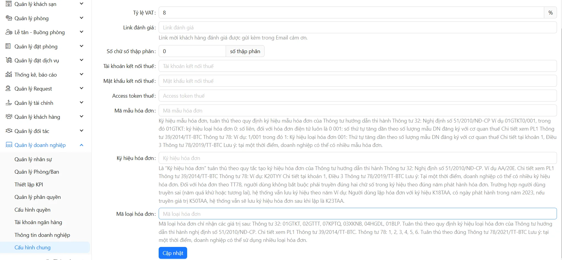 Truy cập module "Quản lý doanh nghiệp", mục "Cấu hình chung":