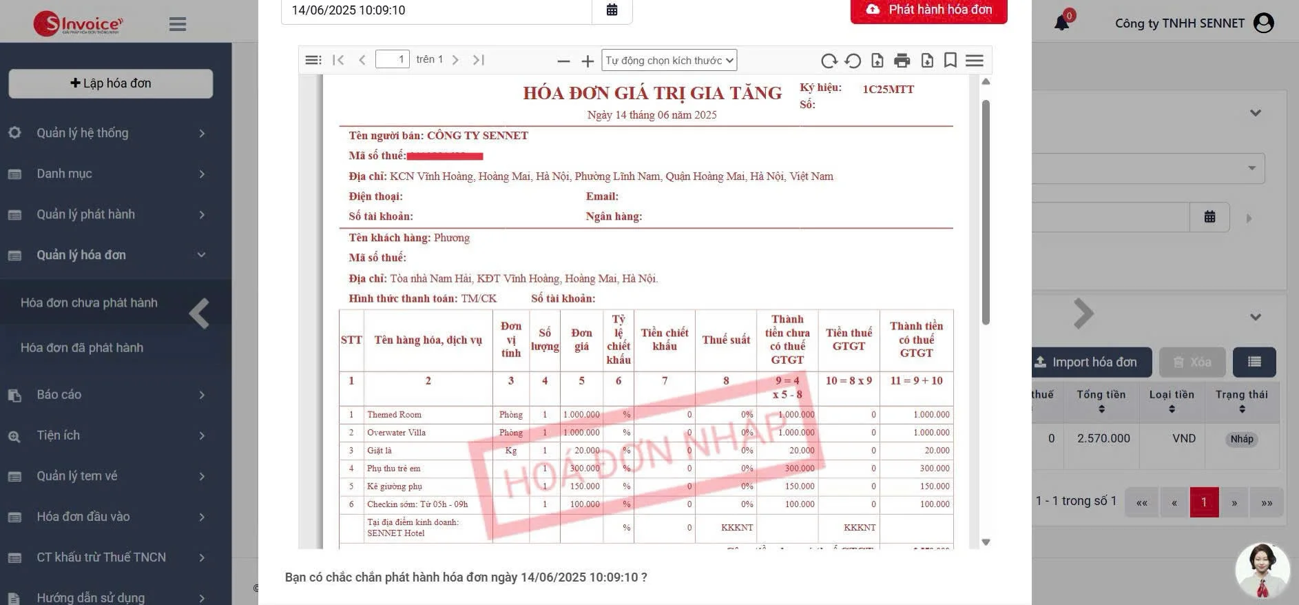 Khi hóa đơn được xuất thành công, phần mềm SENNET sẽ tự động hiển thị Icon "Đã xuất hóa đơn" tại Booking tương ứng. Đồng thời, hóa đơn sẽ được đồng bộ lên phần mềm hóa đơn điện tử và tự động gửi dữ liệu đến Cơ quan Thuế theo quy định.