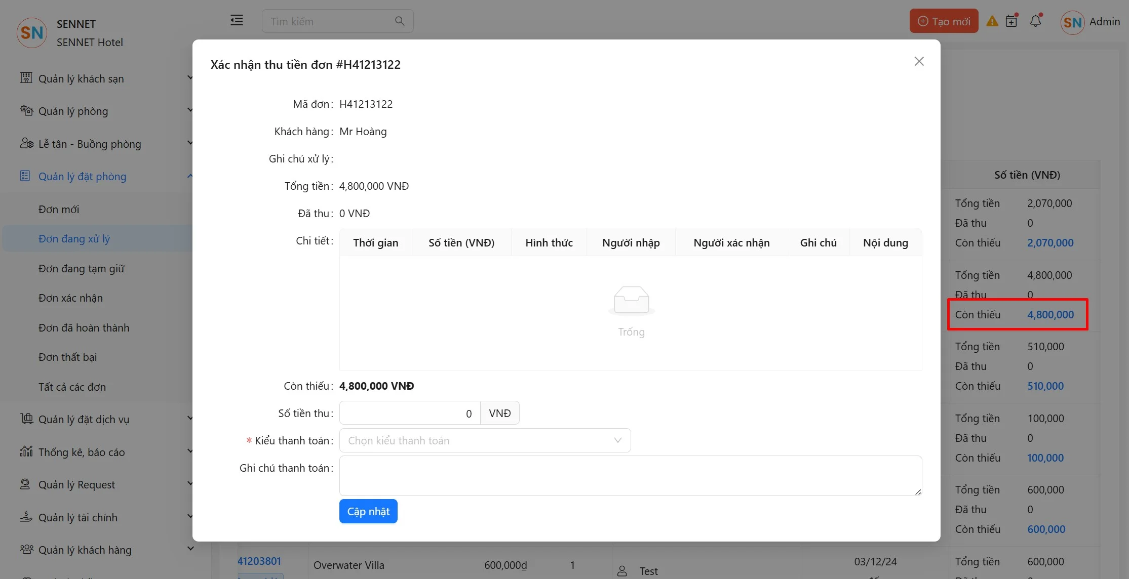 - Khi nhận được bill chuyển tiền của khách thanh toán, bộ phận Kinh doanh xác nhận số tiền đã nhận vào Booking: Truy cập module "Quản lý đặt phòng", mục "Danh sách đơn" (hoặc nhập mã Booking vào ô tìm kiếm tổng thể trên thanh Header), click vào số tiền còn thiếu của Booking để mở popup Xác nhận thu tiền.