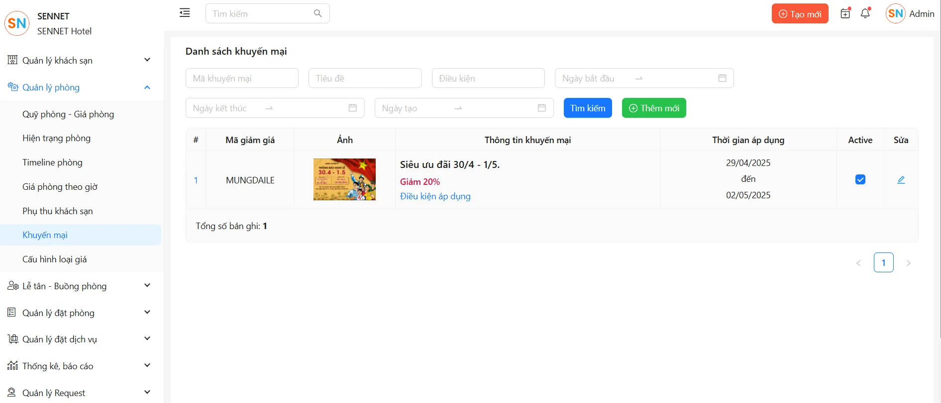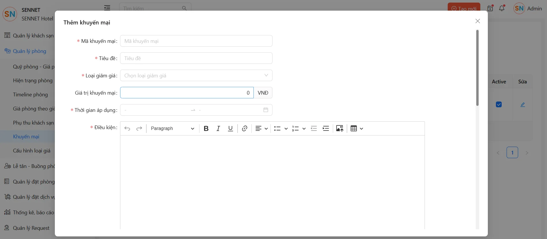 Truy cập module "Quản lý phòng", mục "Khuyến mại":
