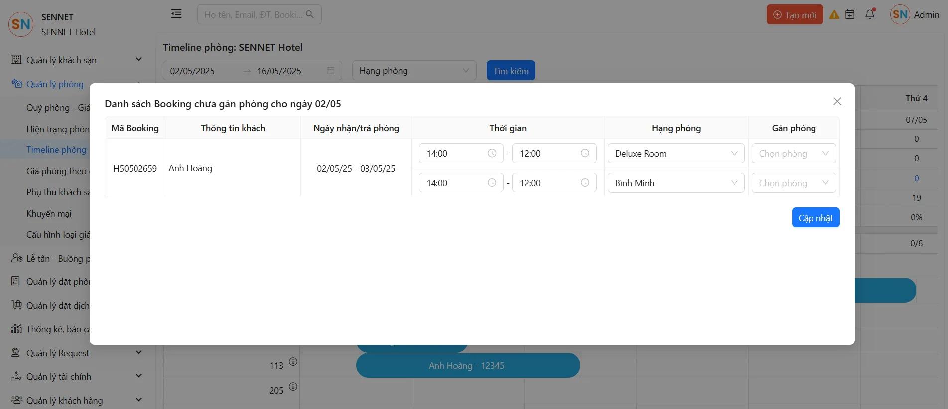 - Người dùng click vào số phòng chưa gán để gán phòng trực tiếp vào Booking từ danh sách các phòng đã xác nhận nhưng chưa được gán.