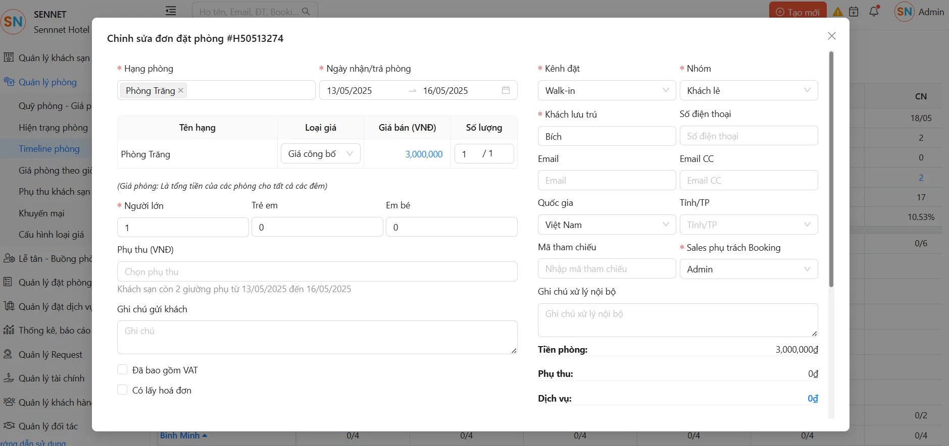 - Click vào phòng muốn chỉnh sửa để mở popup chỉnh sửa đơn đặt phòng.