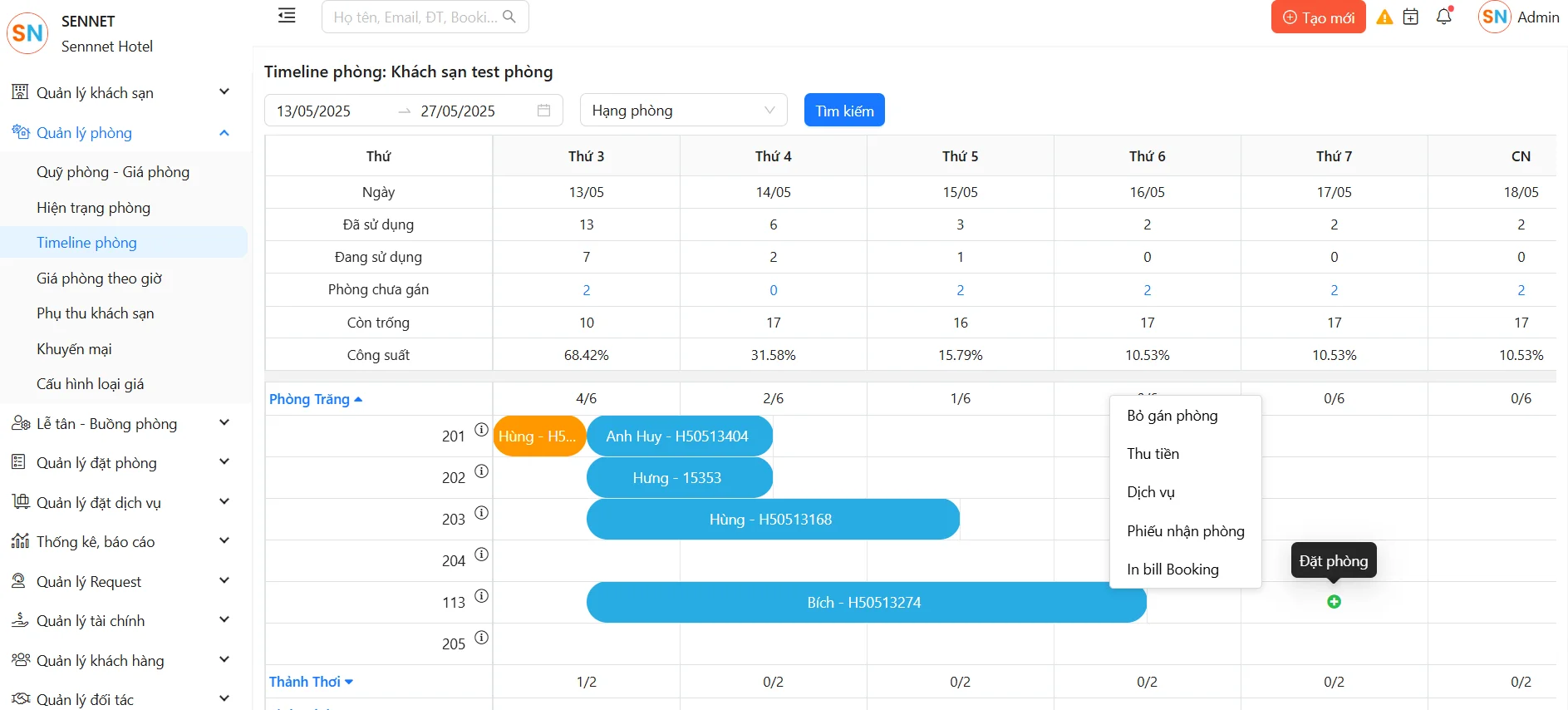 - Chọn phòng và click chuột phải để mở các menu: thu tiền, thêm dịch vụ, in phiếu nhận phòng, in bill Booking.