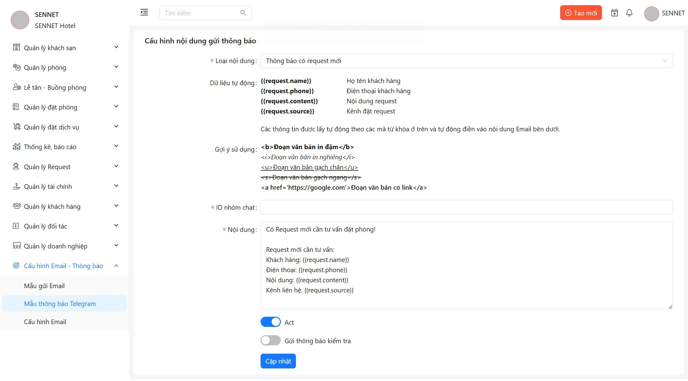 Ghi chú: Với các thông báo mà có nội dung lấy tự động từ Booking, Request..., nếu không muốn lấy tự động thì xóa các biến "dữ liệu tự động" đi.