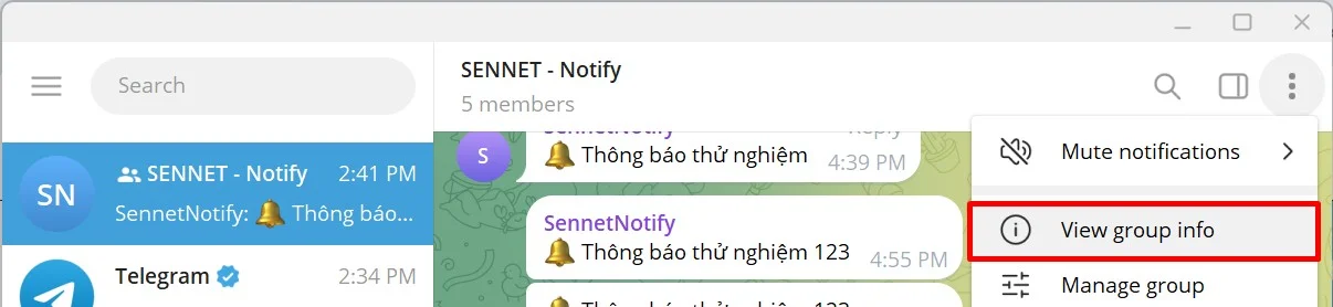 - Trên ứng dụng Telegram (trên máy tính), chọn Group cần gửi thông báo, vào menu "Xem thông tin group" (View group info), hoặc nếu là Telegram trên điện thoại thì chỉ cần click vào tên của nhóm: