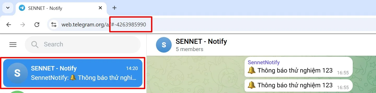 - Sau khi đã đăng nhập, vào nhóm Telegram mà cần gửi thông báo (VD nhóm Kinh doanh), copy ID của nhóm ở trên thanh địa chỉ của trình duyệt web (Copy cả dấu "-" ở đằng trước ID):