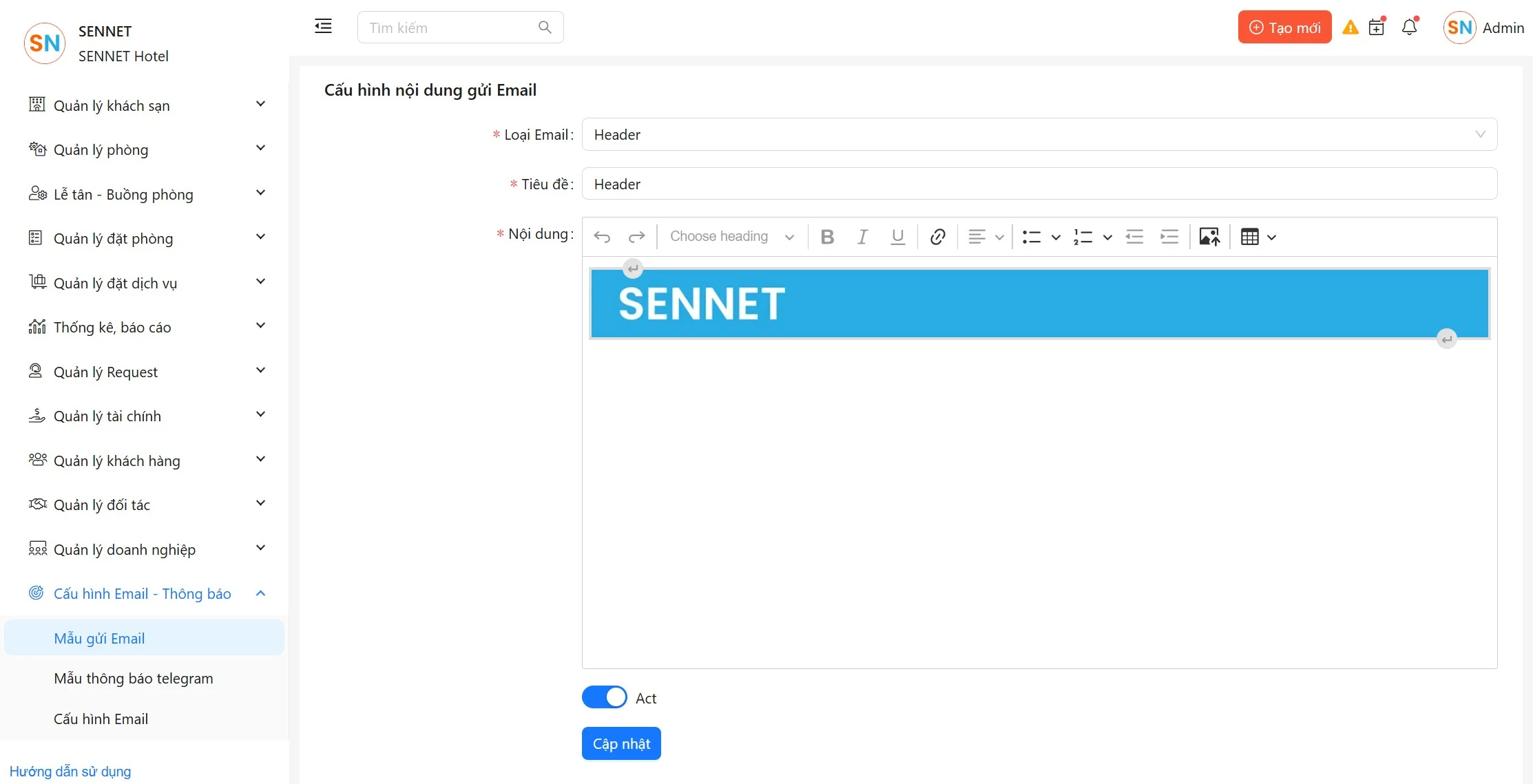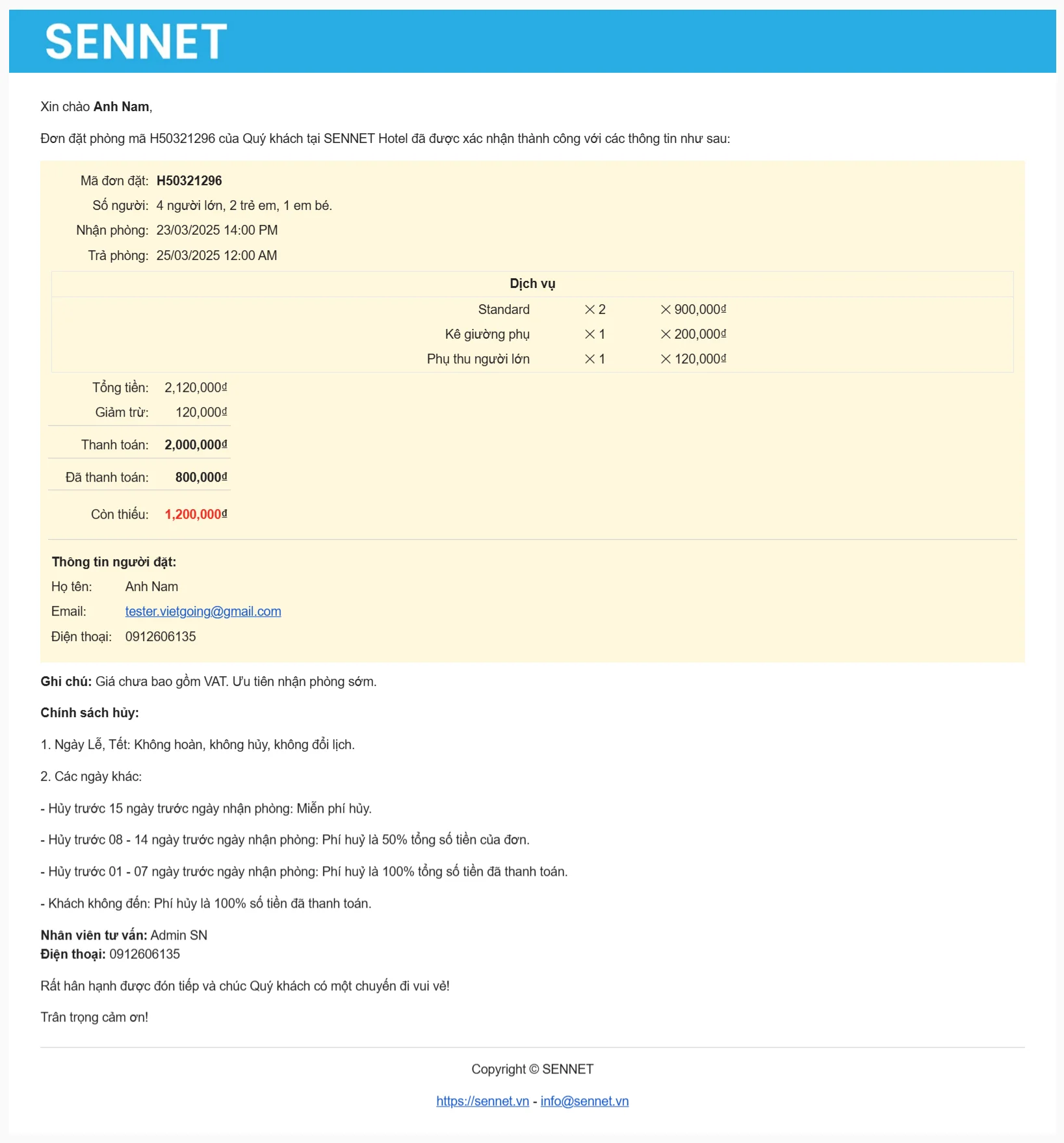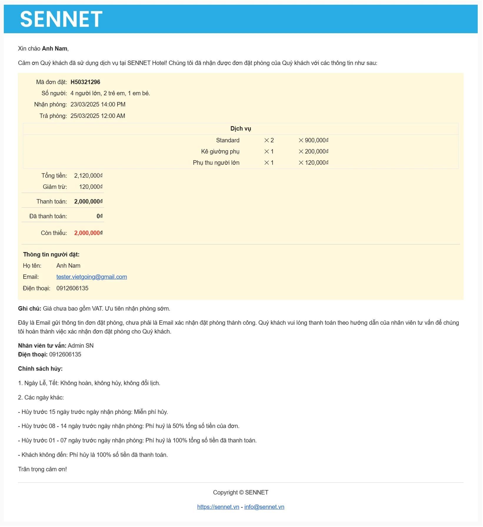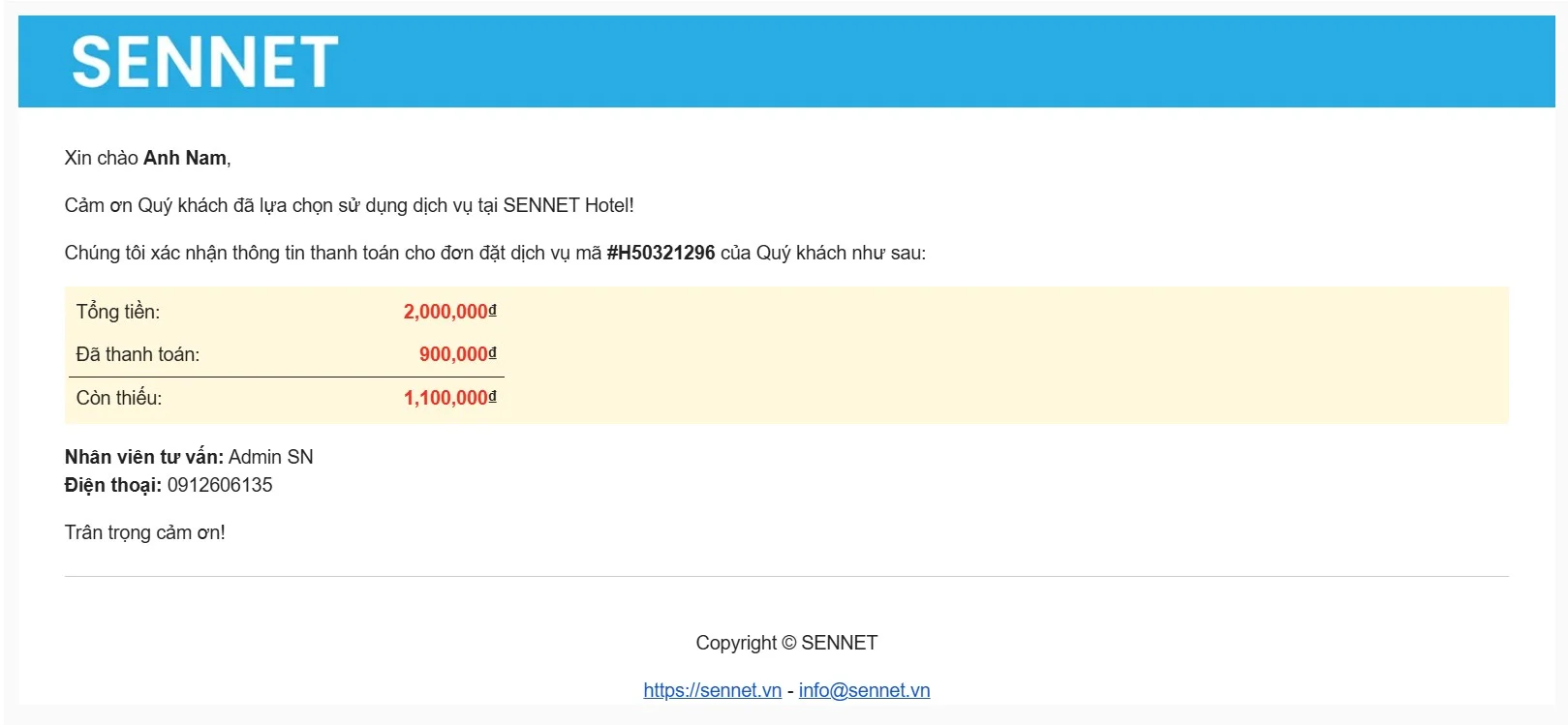 Nội dung chính của các Email sẽ theo mẫu chung trên toàn hệ thống SENNET, còn phần thông tin về thương hiệu (Header và Footer, phần đầu và phần cuối của Email) sẽ được cấu hình riêng theo từng doanh nghiệp (với Đại lý - TA), từng khách sạn (với Khách sạn).