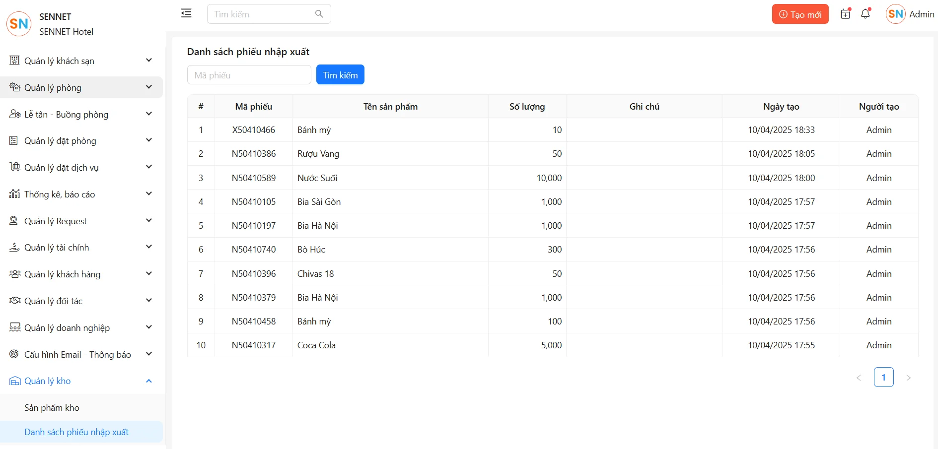 Danh sách phiếu nhập xuất hiển thị các sản phẩm được tạo khi thực hiện nhập hàng hoặc xuất kho, bao gồm thông tin chi tiết như mã phiếu, tên sản phẩm, số lượng, ngày tạo và người tạo phiếu.