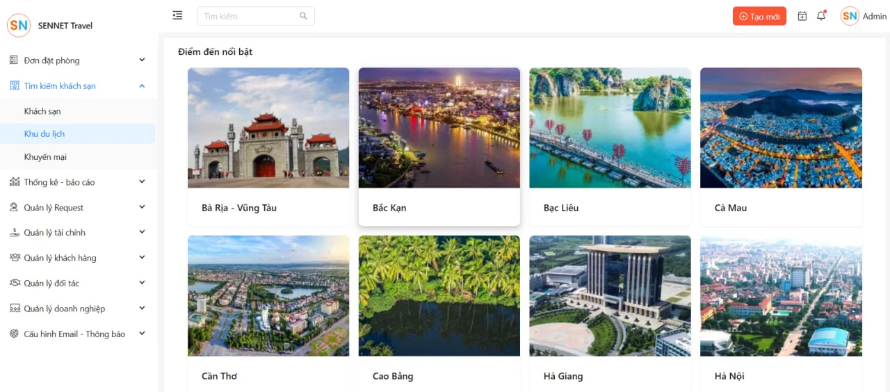 Truy cập module "Tìm kiếm khách sạn", mục "Khu du lịch" lựa chọn khu du dịch cần tìm kiếm khách sạn: