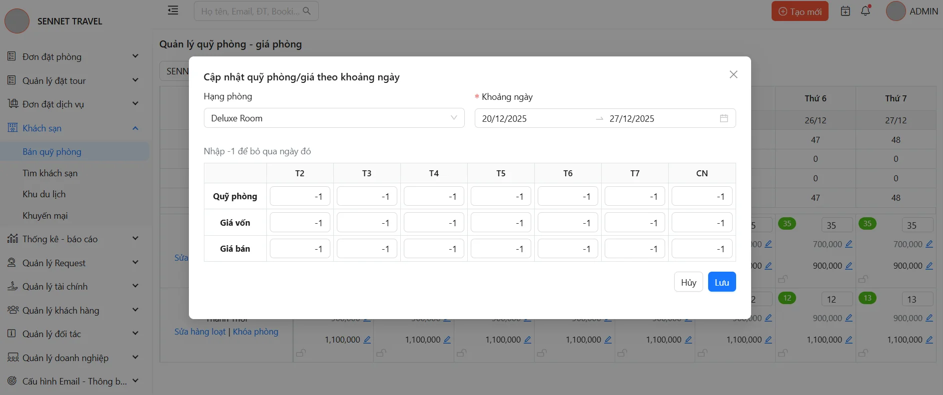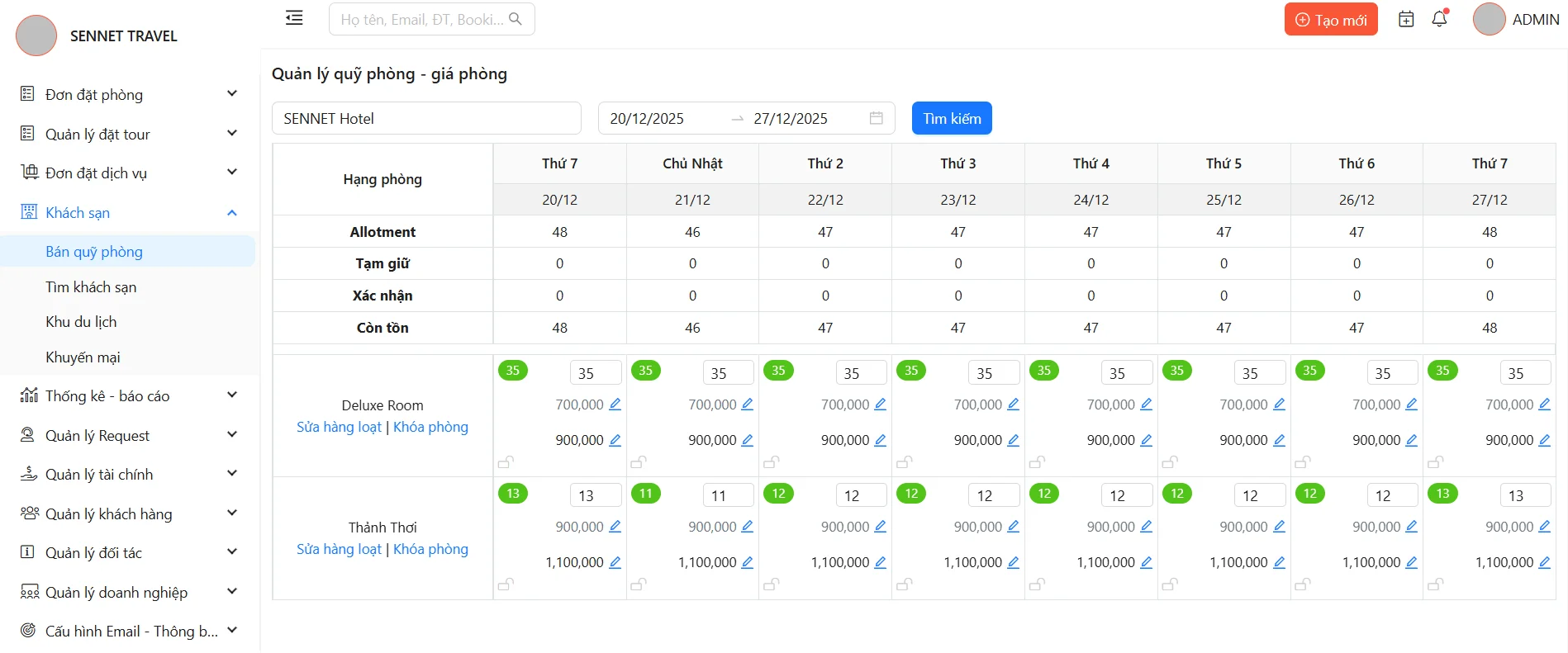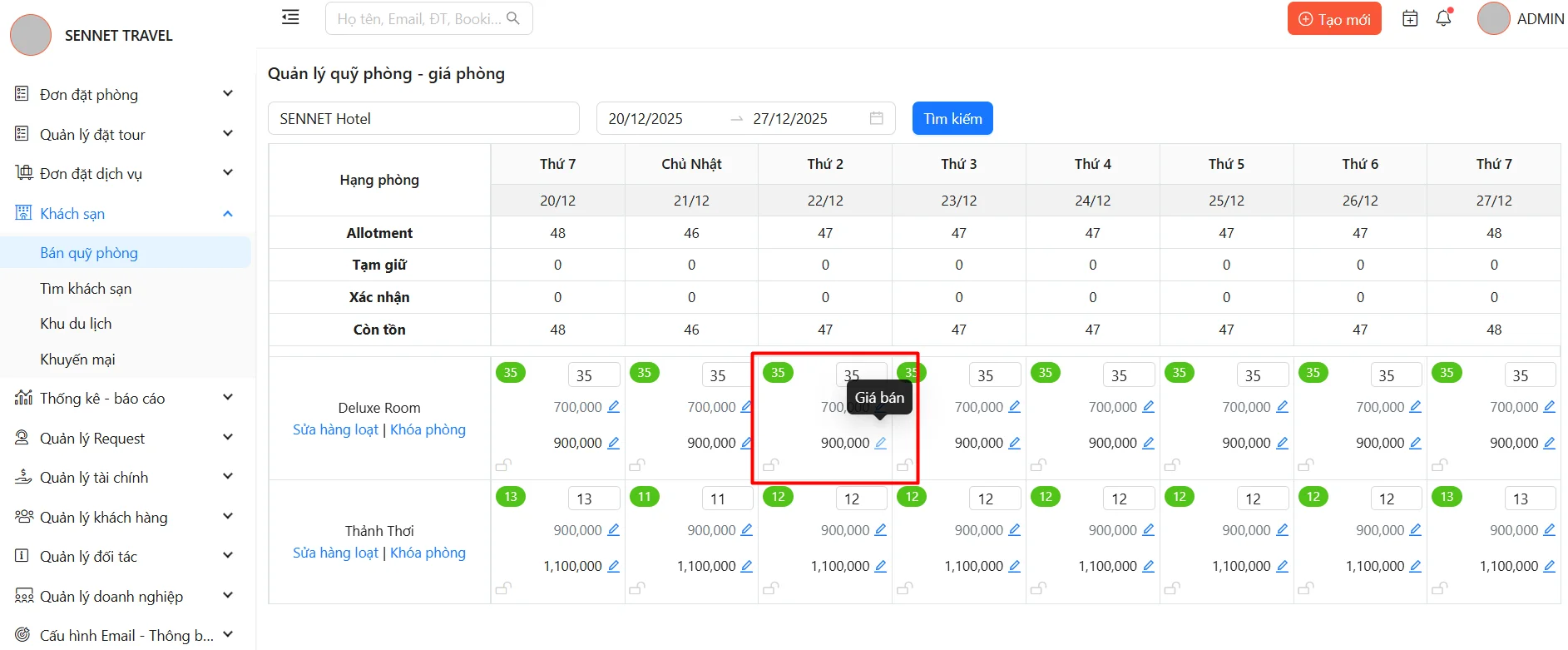 Quản lý Quỹ phòng - Giá phòng giúp người dùng có thể cập nhật quỹ phòng và giá phòng tại mọi thời điểm một cách nhanh chóng và dễ dàng. Đồng thời tính năng này hỗ trợ tiếp cận và kết nối hiệu quả với các CTV, đại lý du lịch đang sử dụng phần mềm SENNET để mở rộng kênh bán và tăng doanh thu.
