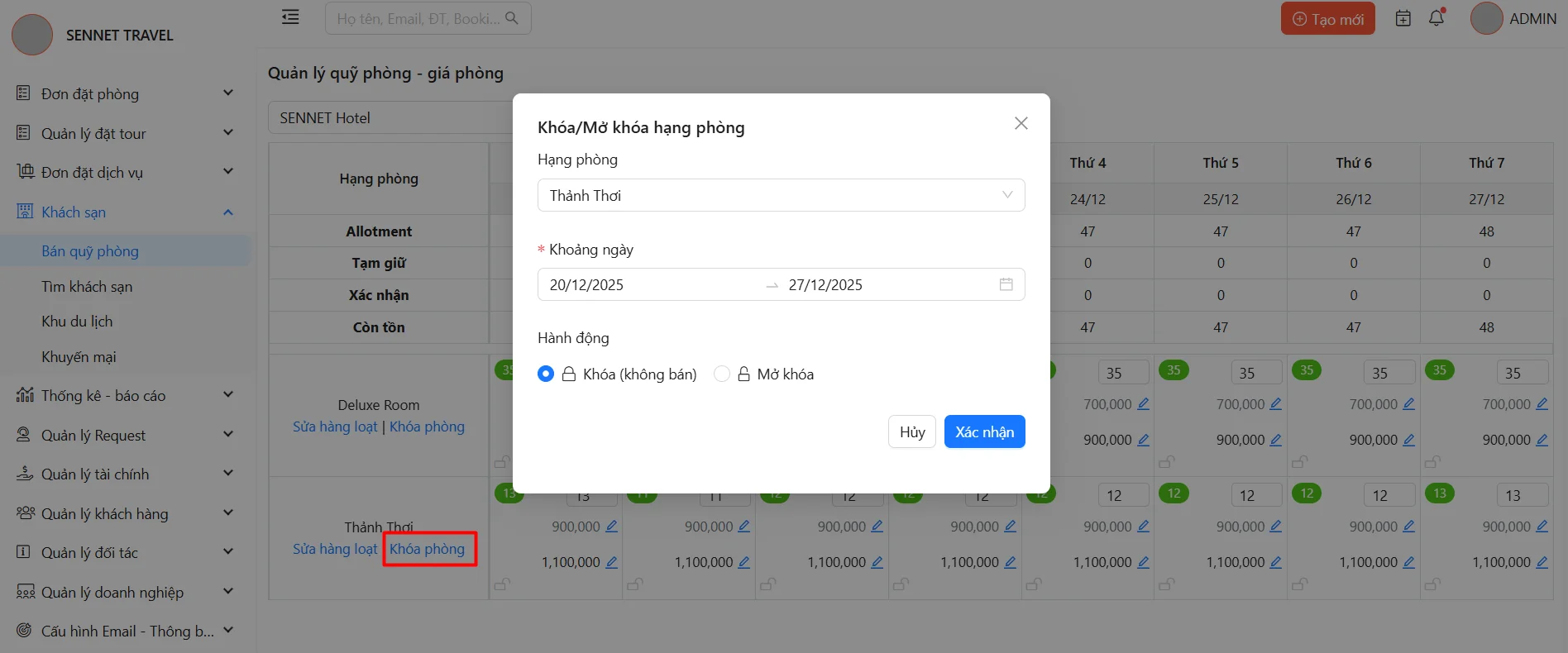 - Khóa hạng phòng theo một khoảng thời gian: Click vào "Khóa phòng":