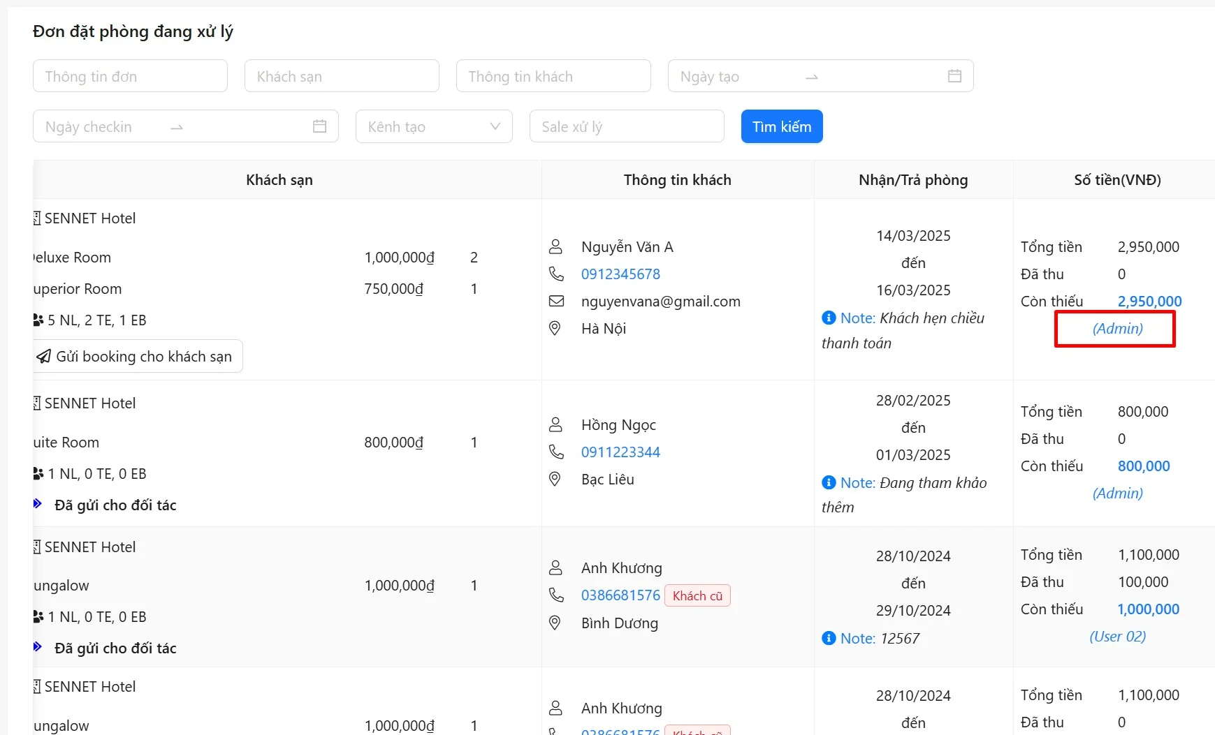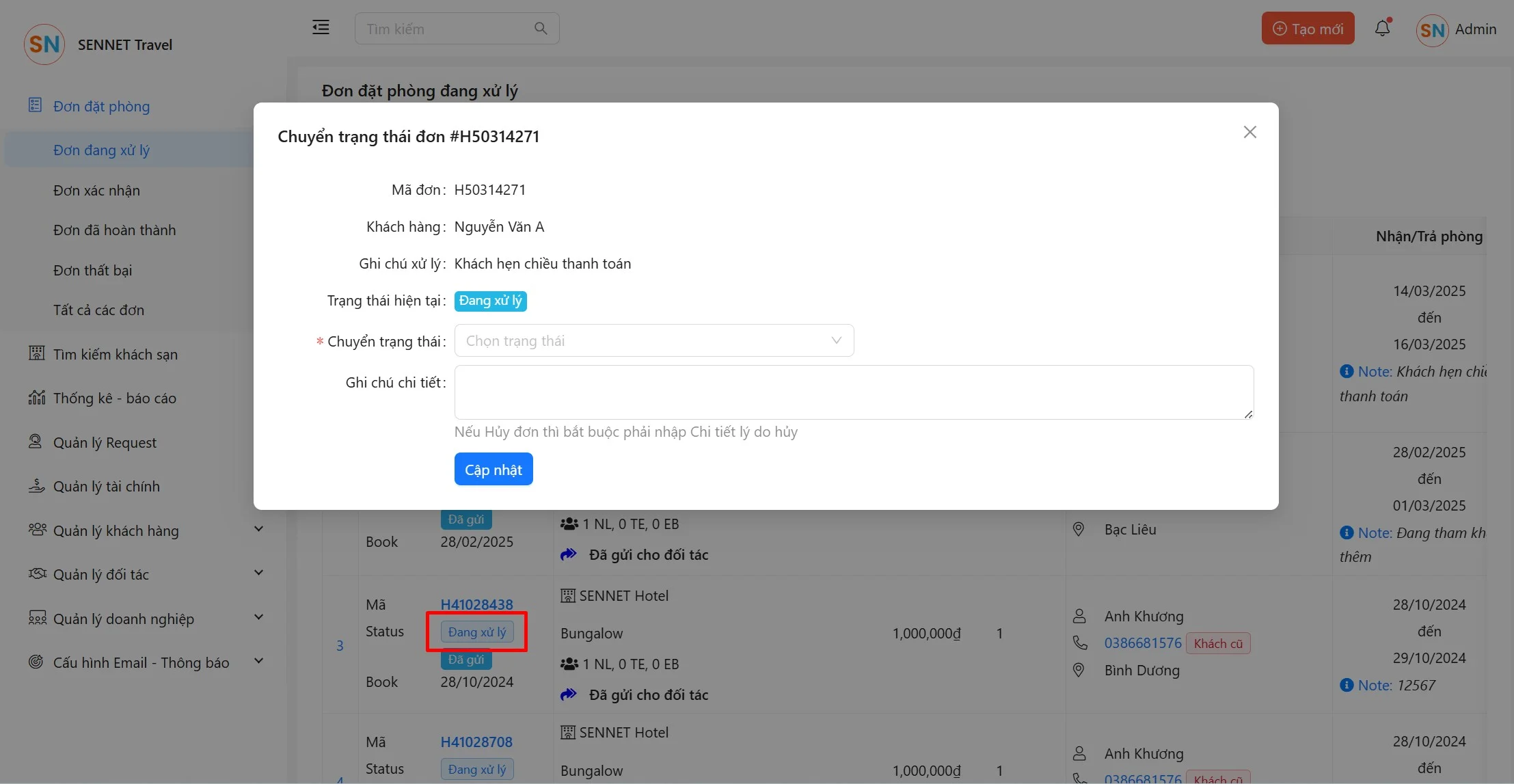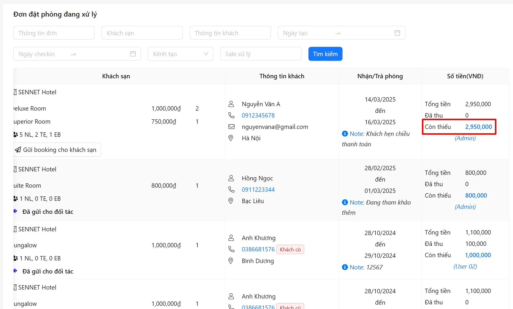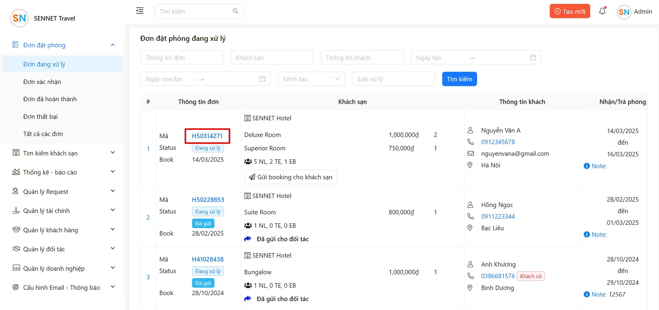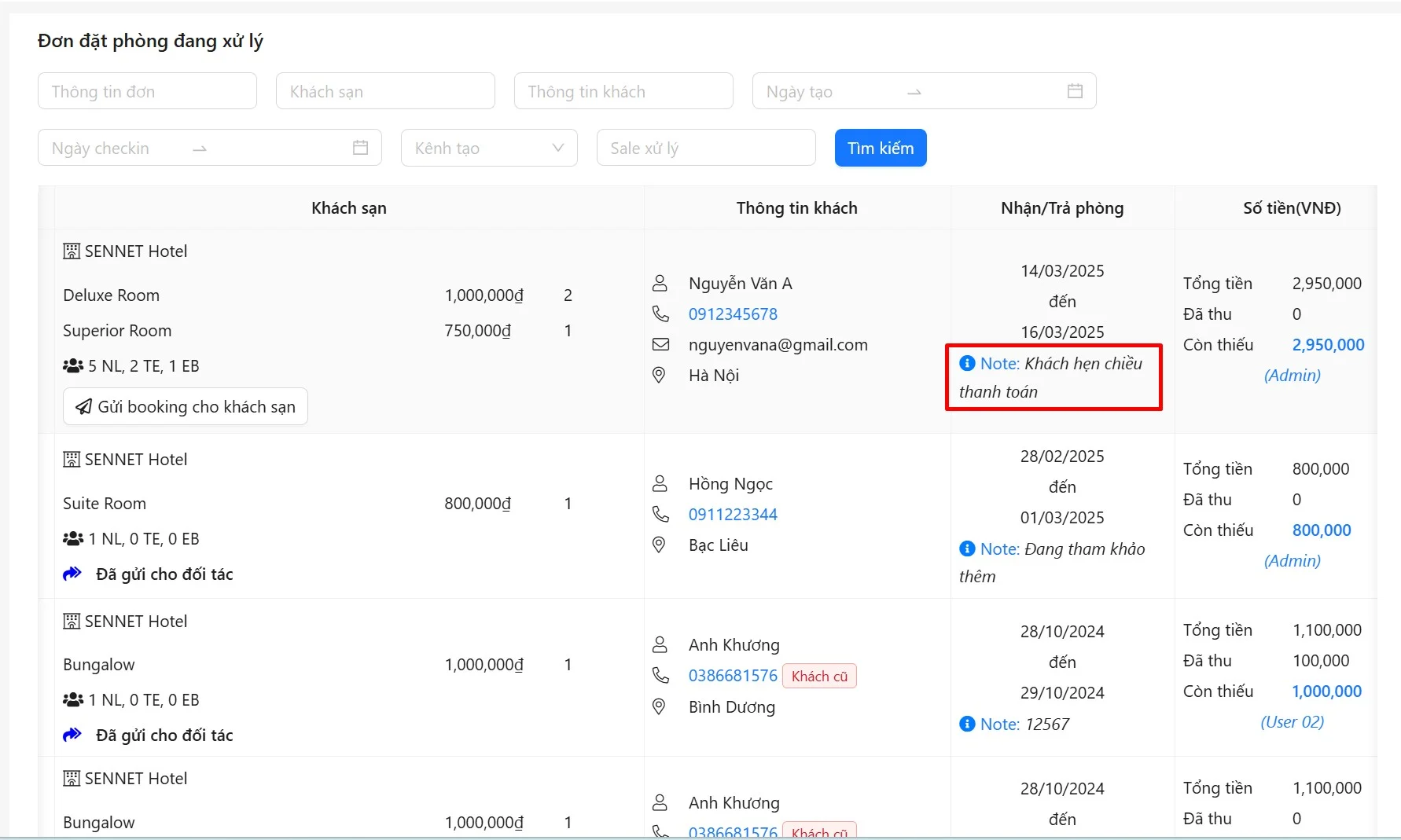 - Đơn đang xử lý: Là những Booking vẫn đang ở quá trình tư vấn khách hàng, chưa được xác nhận đặt phòng.