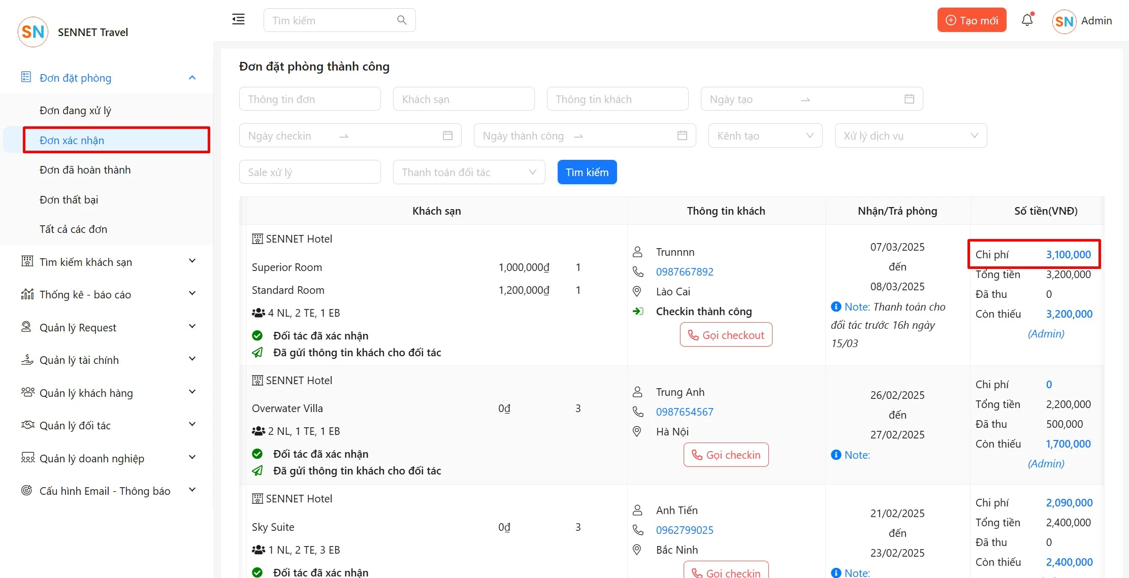 - Đơn xác nhận: Là những Booking khách đã xác nhận đặt.