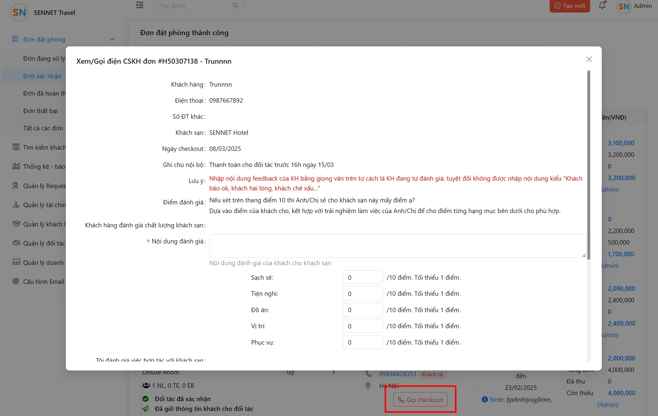 Với các đơn đã xác nhận, sau khi khách đã Checkout 01 ngày thì ở danh sách Booking sẽ có tính năng "Hỏi thăm Checkout", để nhân viên tư vấn sẽ liên hệ hỏi thăm khách về quá trình sử dụng dịch vụ xem có hài lòng không, xin ý kiến đánh giá của khách hàng, cảm ơn khách và nhắc khách quay lại sử dụng dịch vụ ở các lần sau. Tính năng này nhằm giúp cho việc chăm sóc khách hàng được tốt hơn, gia tăng trải nghiệm khách hàng tốt hơn.