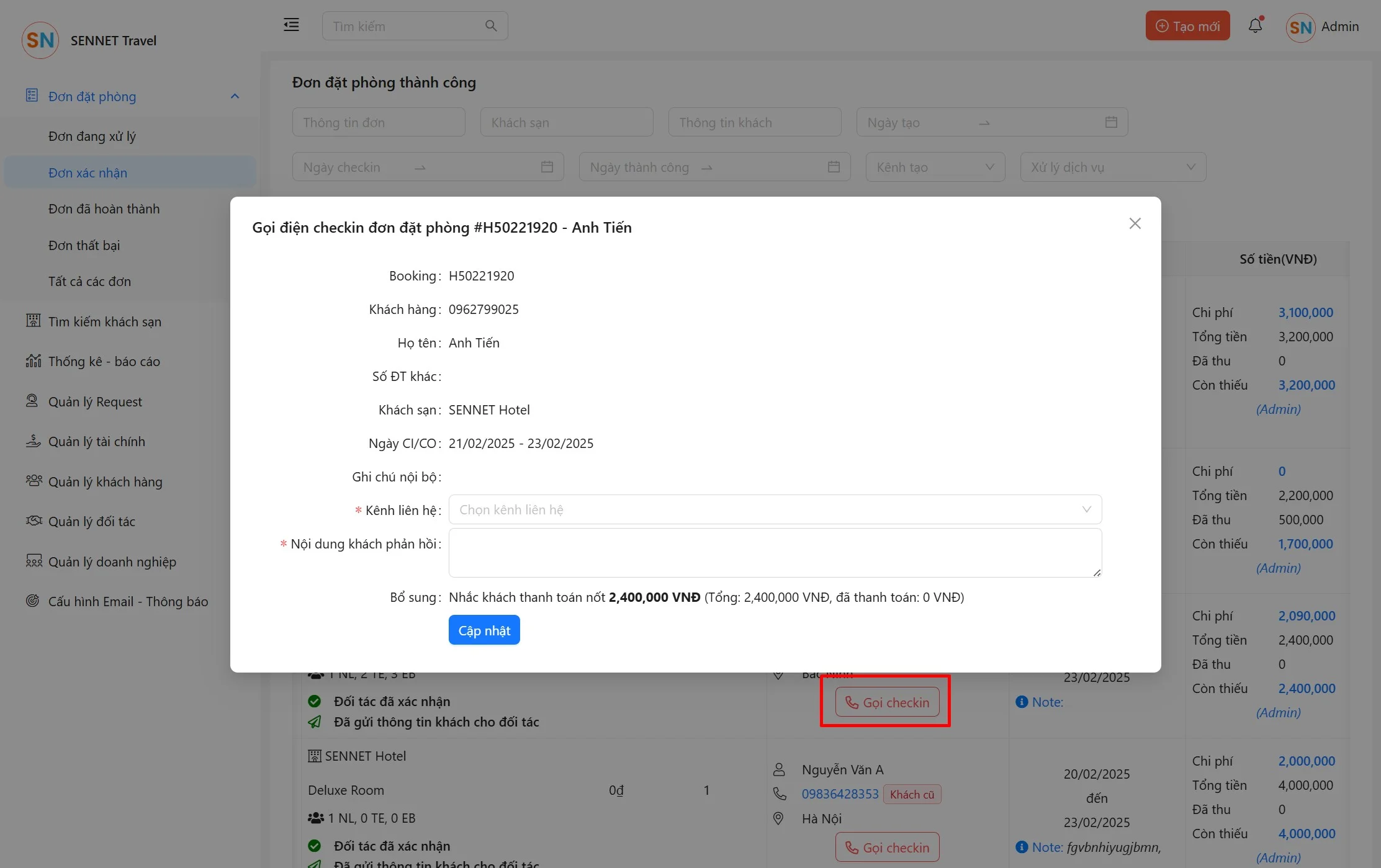 Với các đơn đã xác nhận, vào đúng ngày mà khách Checkin thì ở danh sách Booking sẽ có thêm tính năng "Gọi điện Checkin", để nhân viên tư vấn liên hệ với khách hỏi thăm về việc nhận phòng xem có vấn đề gì không, đồng thời chúc khách hàng có kỳ nghỉ vui vẻ. Tính năng này nhằm giúp cho việc chăm sóc khách hàng được tốt hơn, gia tăng trải nghiệm khách hàng tốt hơn.