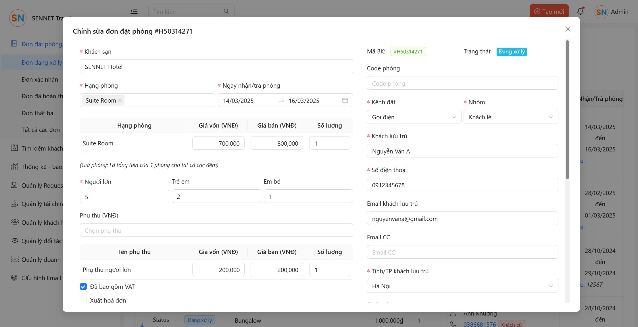 Truy cập module "Đơn đặt phòng", vào danh sách các Booking, click vào mã Booking để mở popup chỉnh sửa thông tin của Booking.