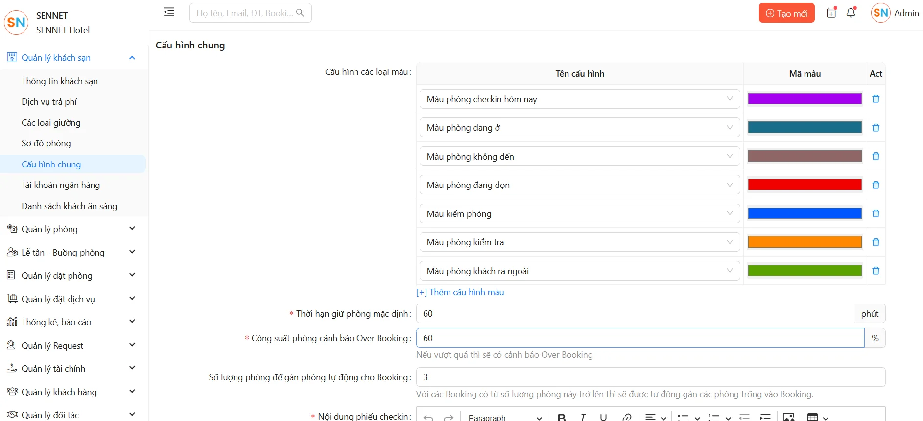 Tính năng này cho phép cấu hình một số các thông tin chung của khách sạn.